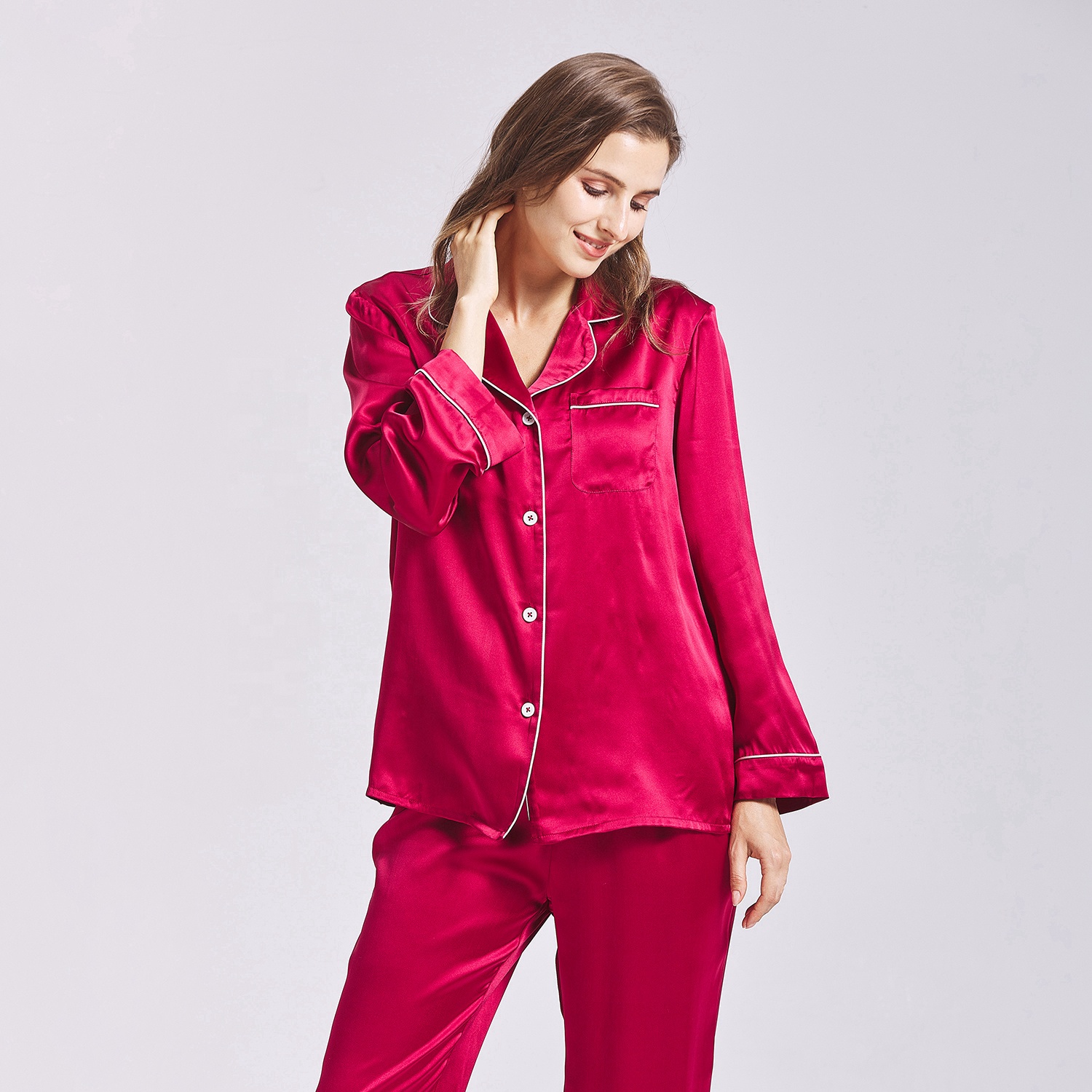 Rose Red Long Sleeves 100% Mulberry Silk Pajamas Luxury Elastic Waist Pure Silk Pajama Set 22 Momme Women Silk Sleepwear