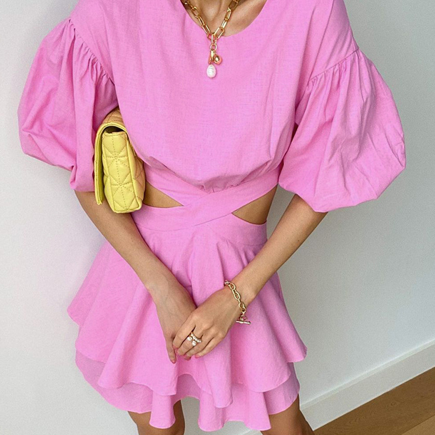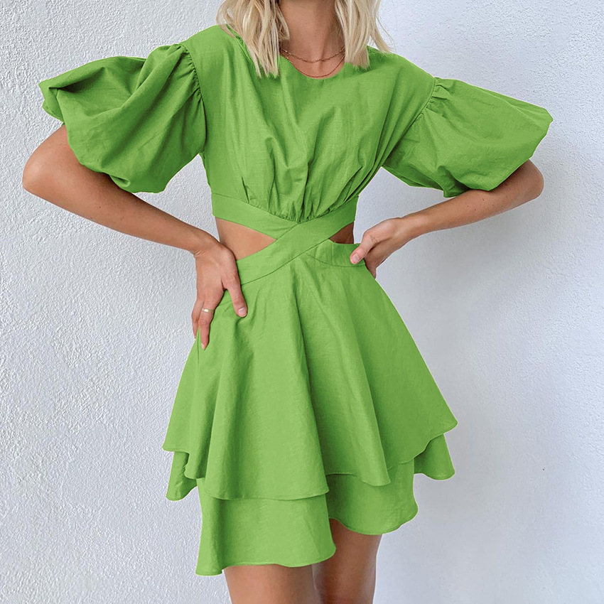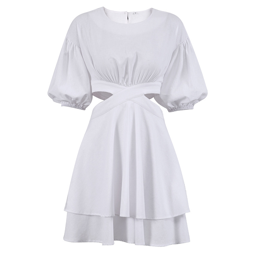 Summer Dresses Women 2023 Puff Sleeve White Cotton Linen Ruffle Hollow Out A Line Dress
