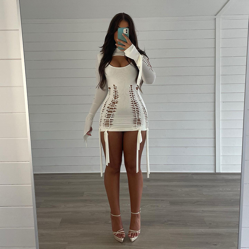 Autumn New Fashion Long Sleeve Knitted Hollow Lace-up Wrapped Hip Dress Women