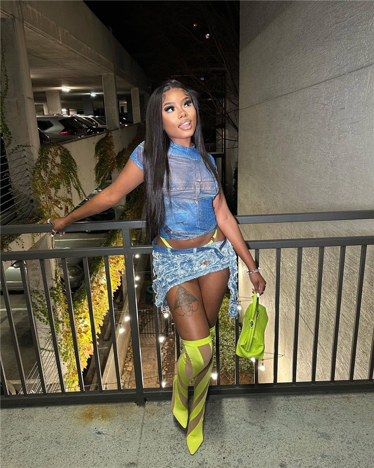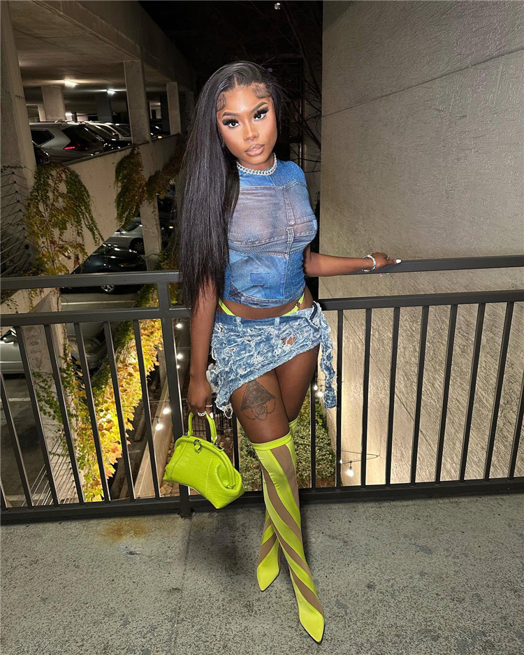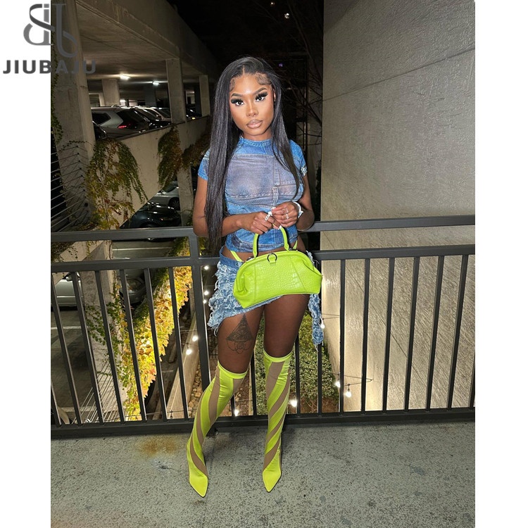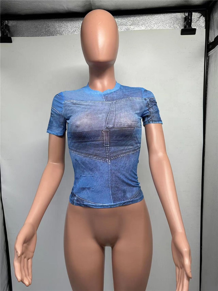 Summer O-Neck Short Sleeve Fashion Design Denim Print Mesh T-Shirt Women