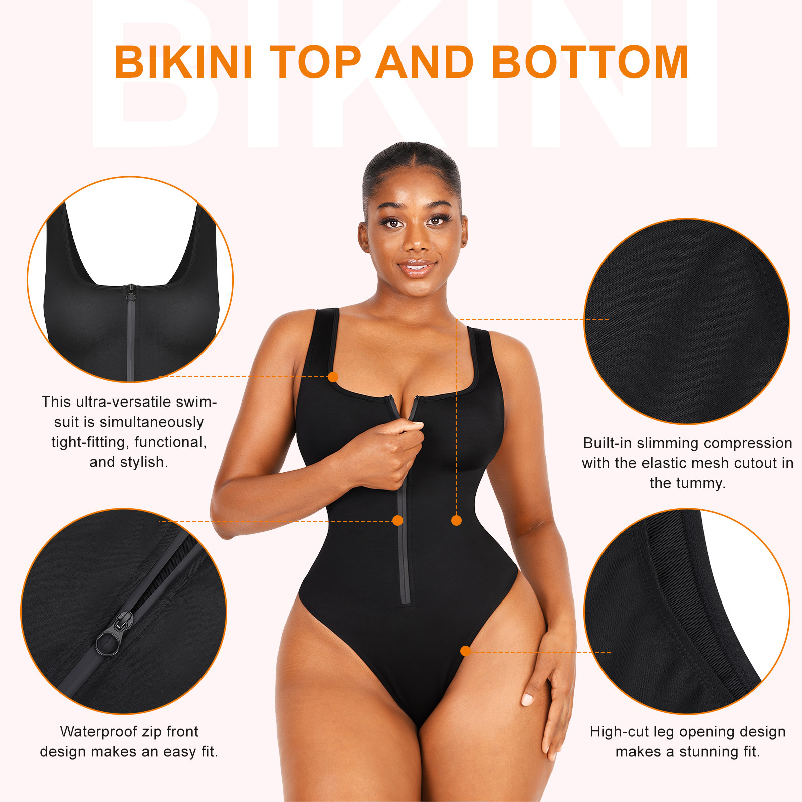 MATERIAL | • This ultra-versatile swimsuit is simultaneously tight-fitting, functional, and stylish. • Waterproof zip front design makes an easy fit. • Built-in slimming compression with the elastic mesh cutout in the tummy. • High-cut leg opening design makes a stunning fit. • Comfy lining that feels second-skin. |