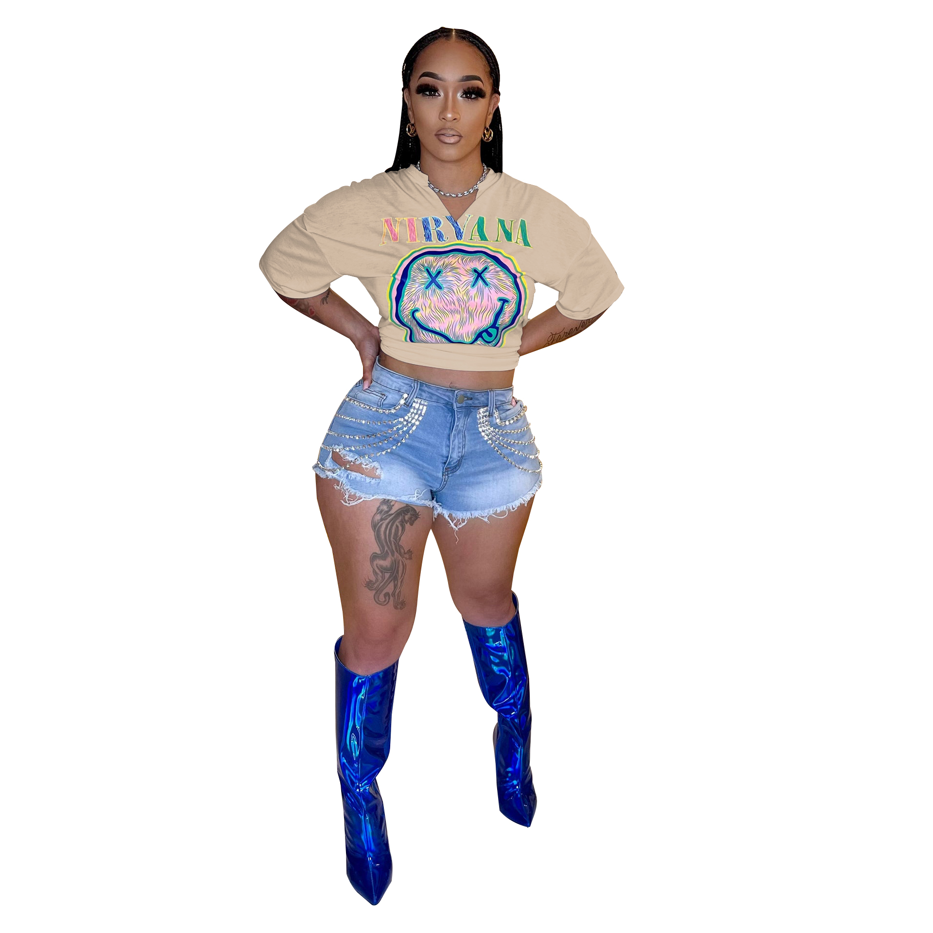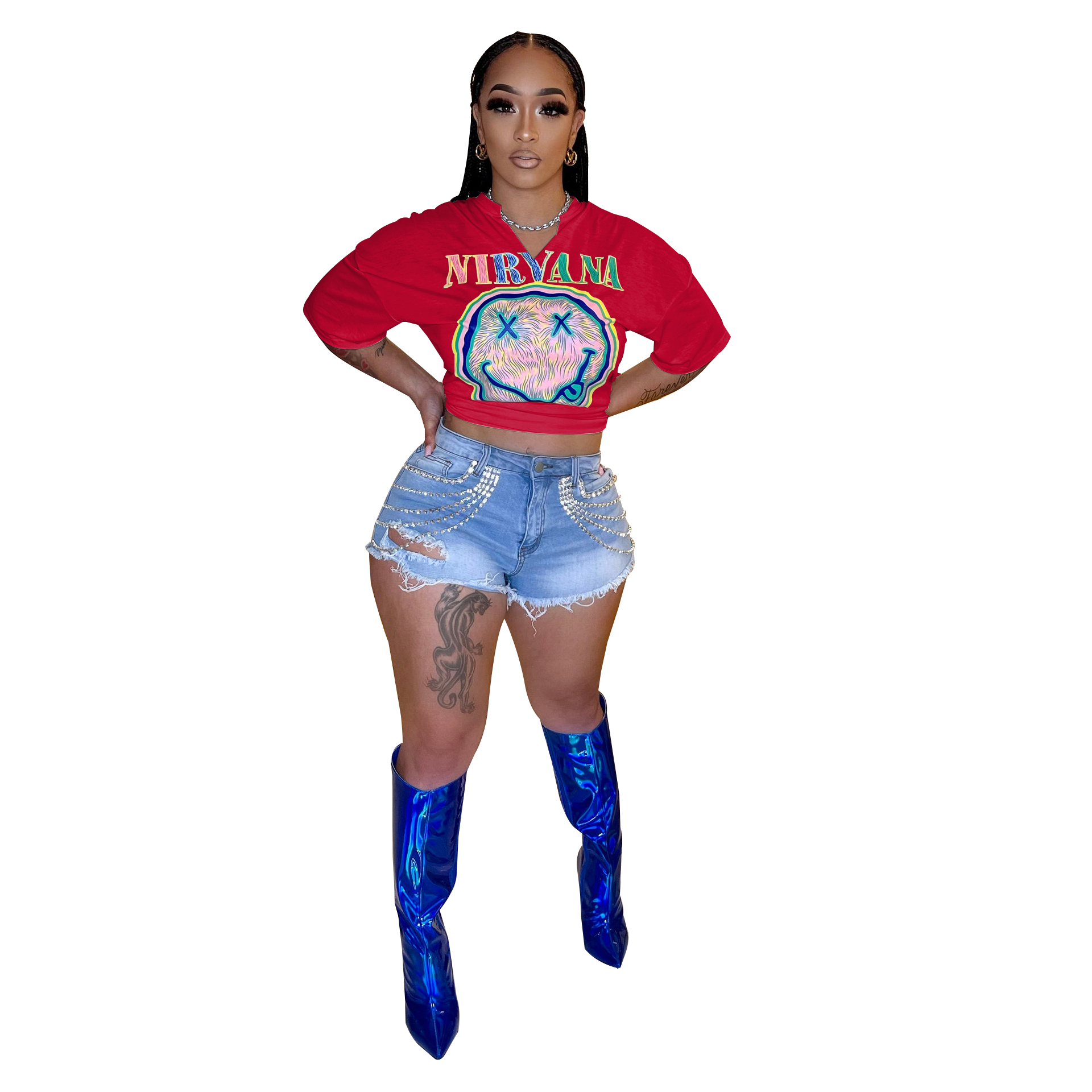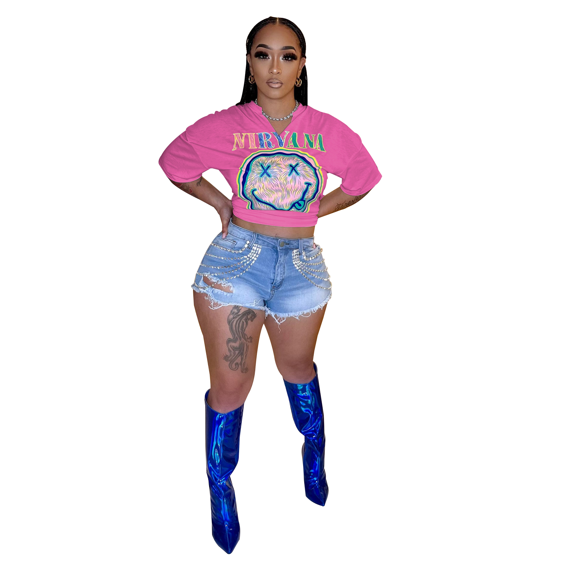 8 Colors summer smiling face printed short sleeve cotton elastic crop top t-shirt women