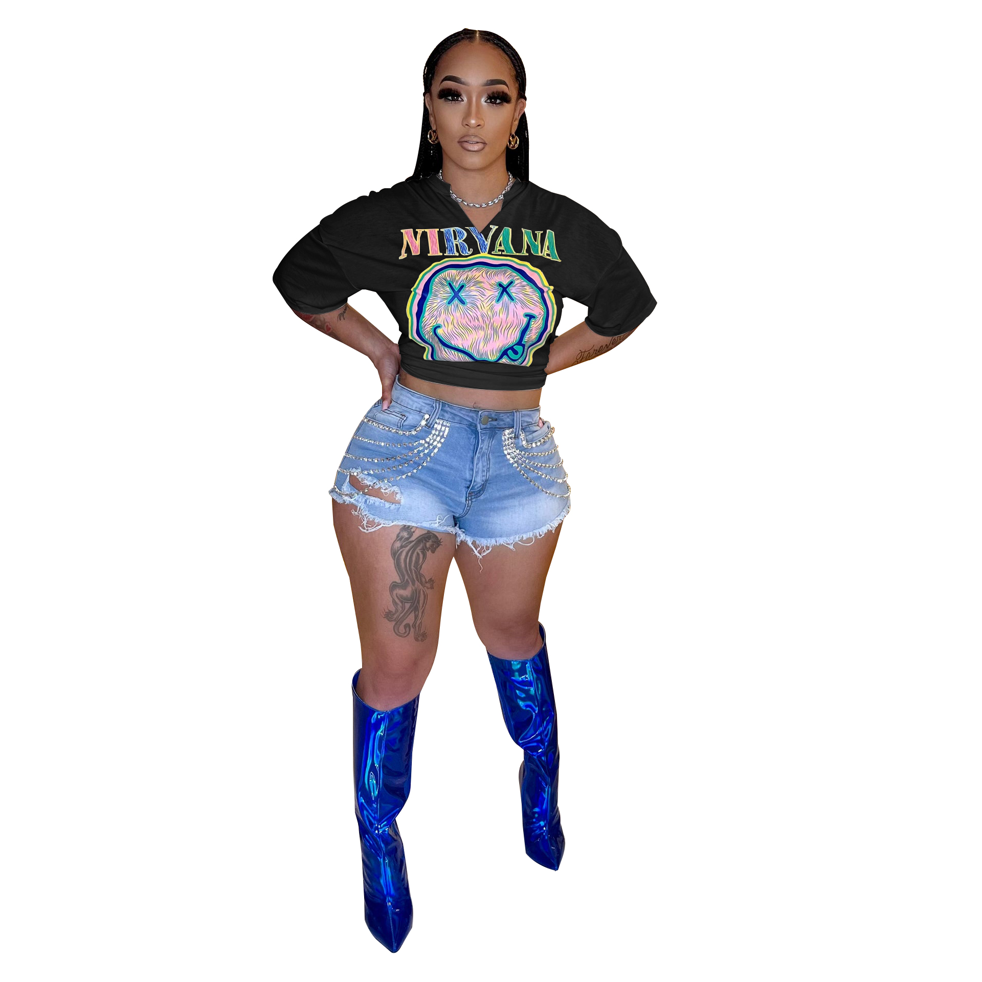 8 Colors Summer Smiling Face Printed Short Sleeve Cotton Elastic Crop Top T-shirt Women
