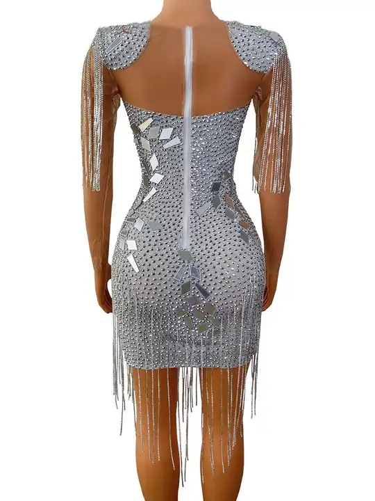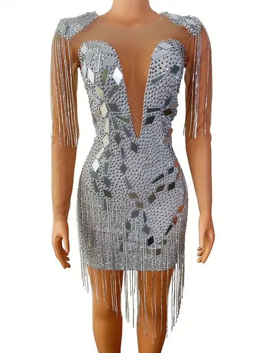 Ojw040692 Mirror Sequined Rhinestone Tassel Deep V Sexy Mini Dancing Wear Elegant Luxury Sequin Dress For Women