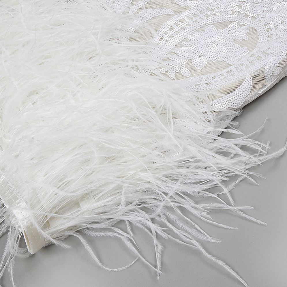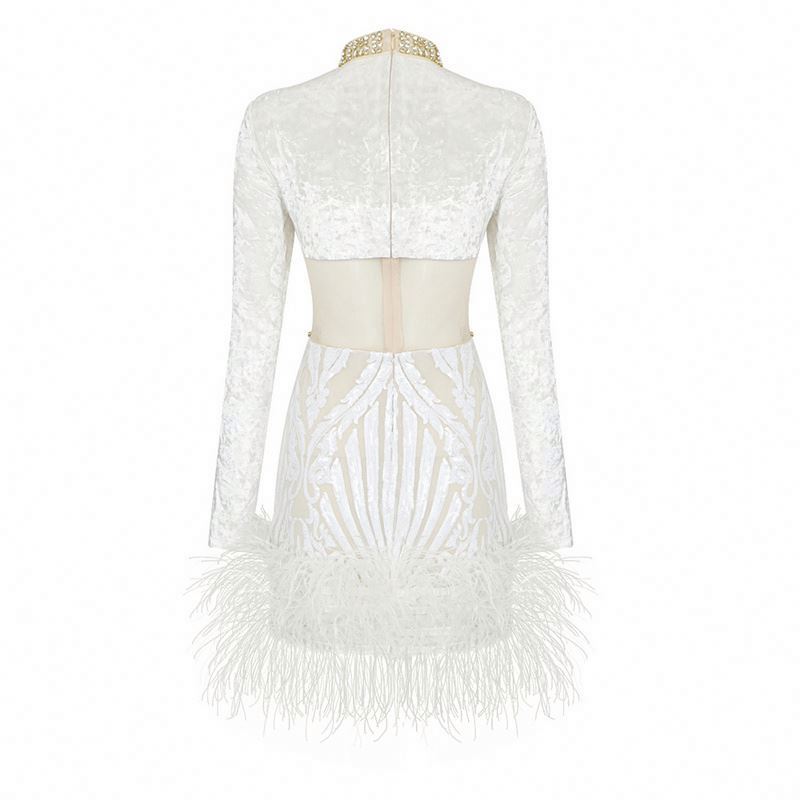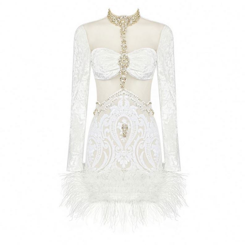 Fashion Sexy Mini Dress White Lace Long Sleeve Feather Halter Women Evening Cocktail Party Women Wedding Dresses