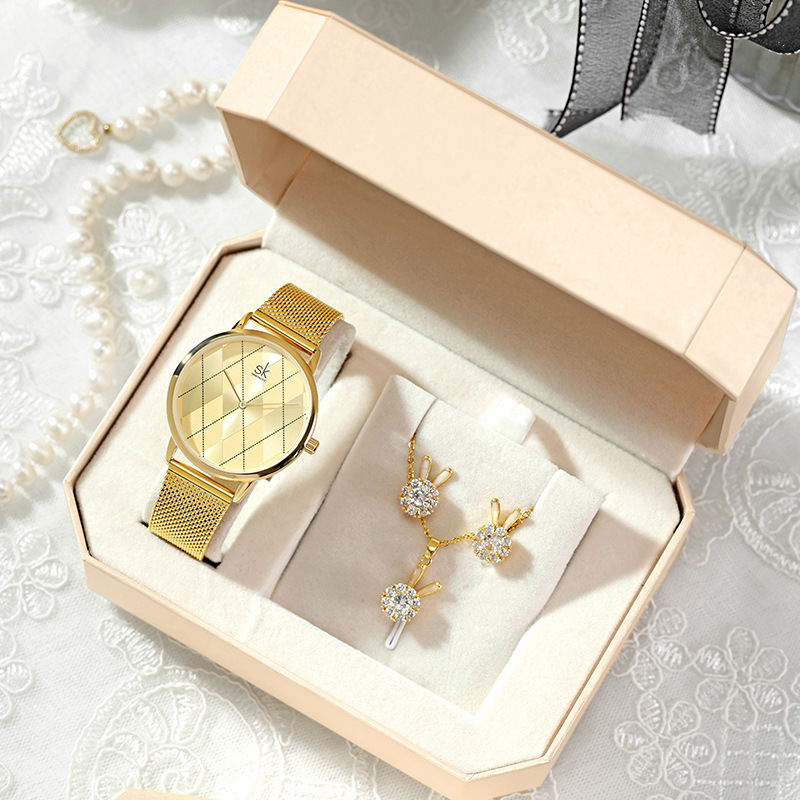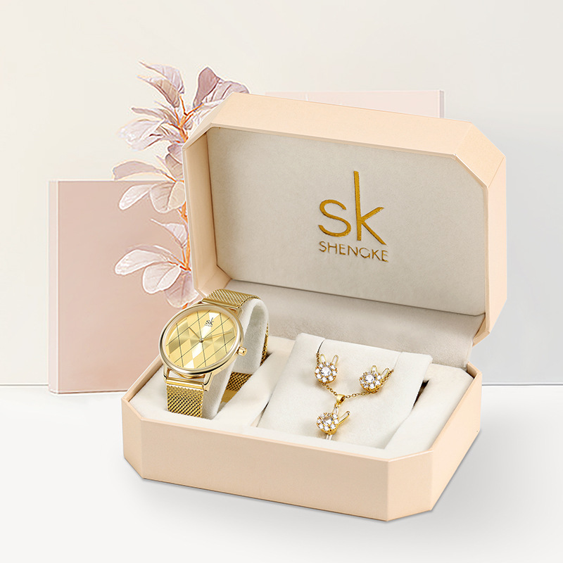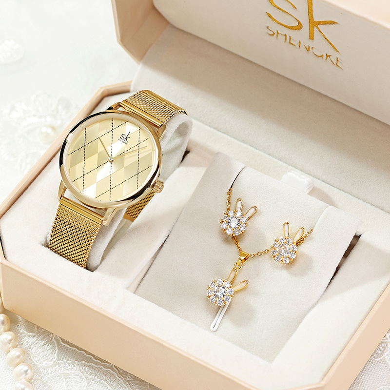3Pcs Set Luxury Watch Ladies Quartz Diamond Wrist Watch SHENGKE 0121 Elegant Female Earring Necklace Watches for Women's Gift