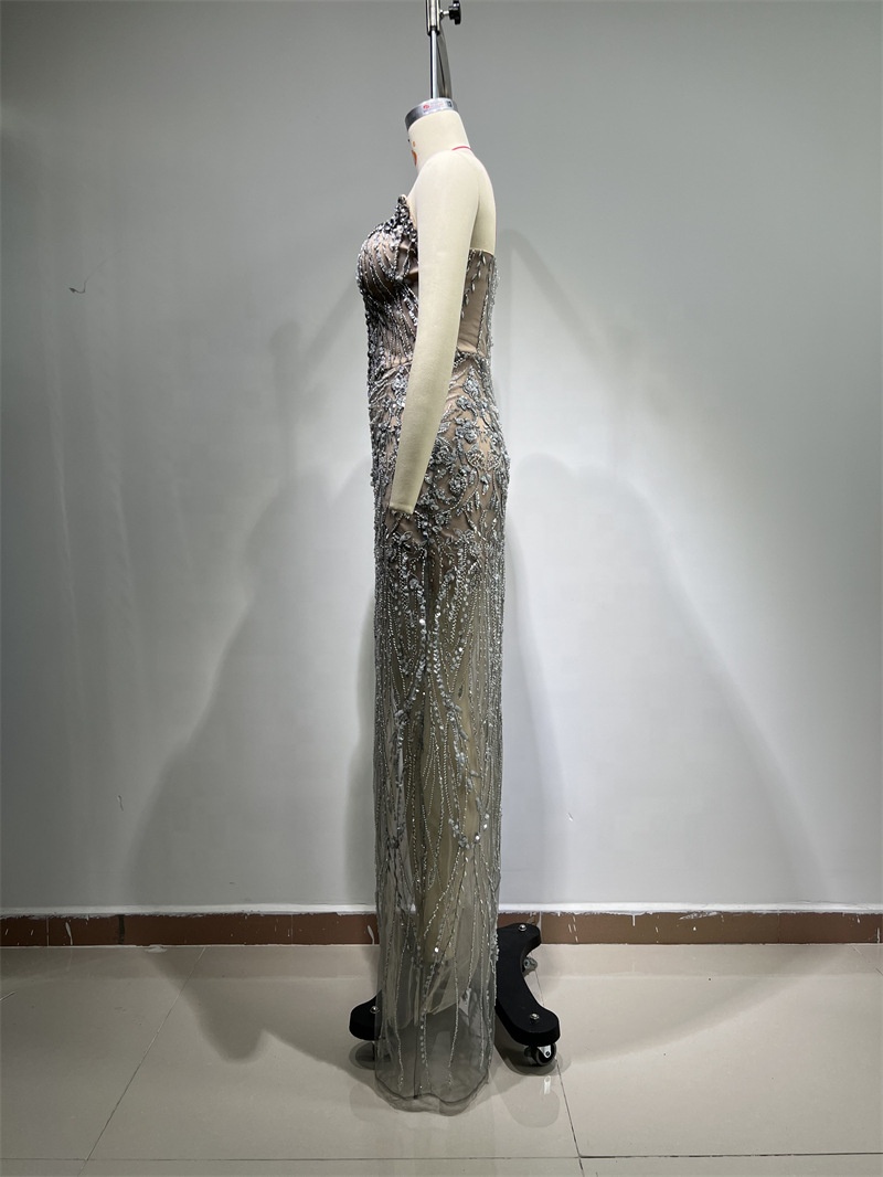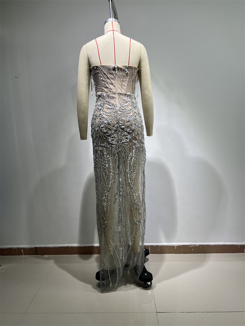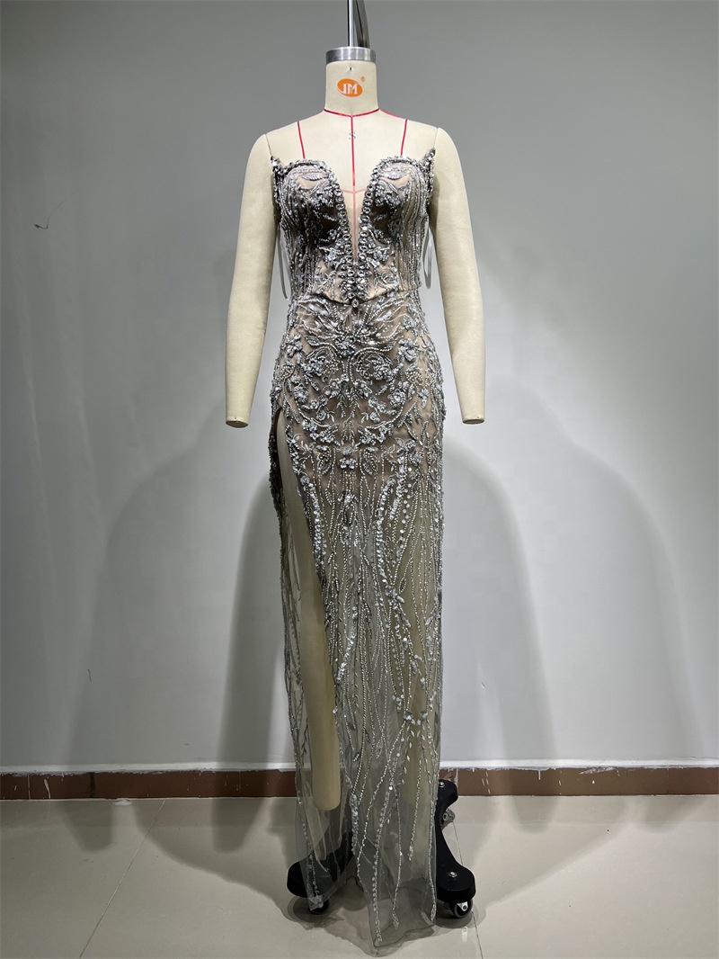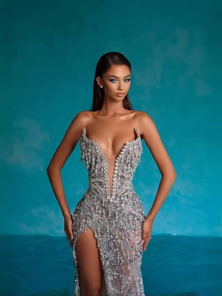 Women's Summer Fashion Dress Heavy Rhinestone Nail Beads Sexy Low Cut High Split Top Dress Luxury Dinner Red Carpet Dress