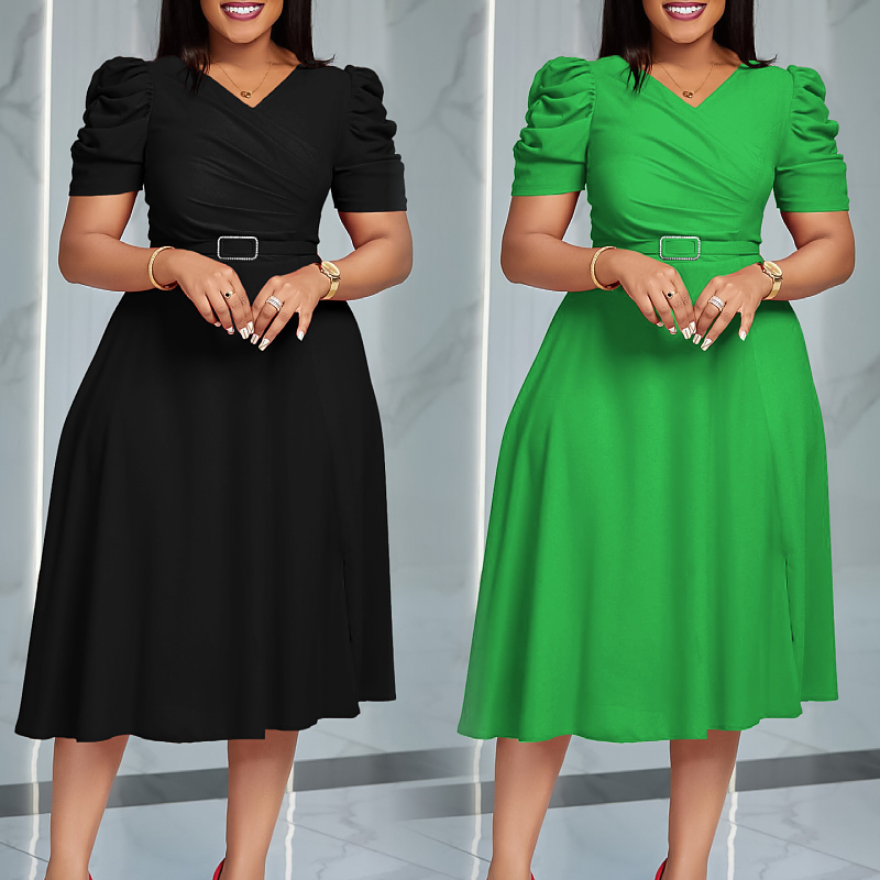 Women's Clothes Ladies New V-neck Short Sleeves Waist Temperament Lady Elegant Dresses Pleated Large Swinging Women Casual Dress