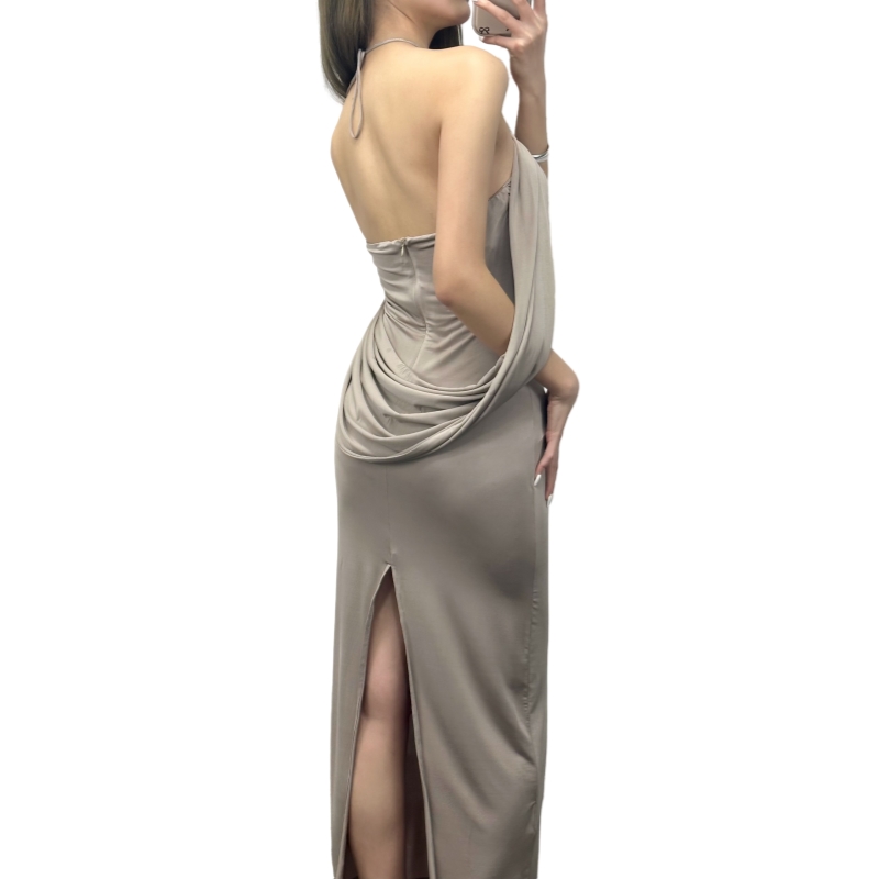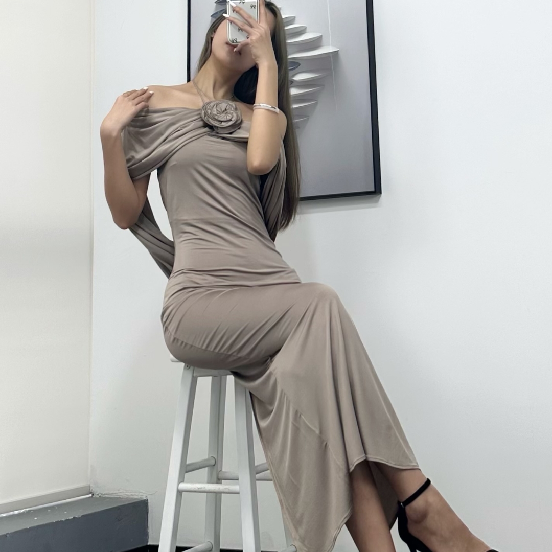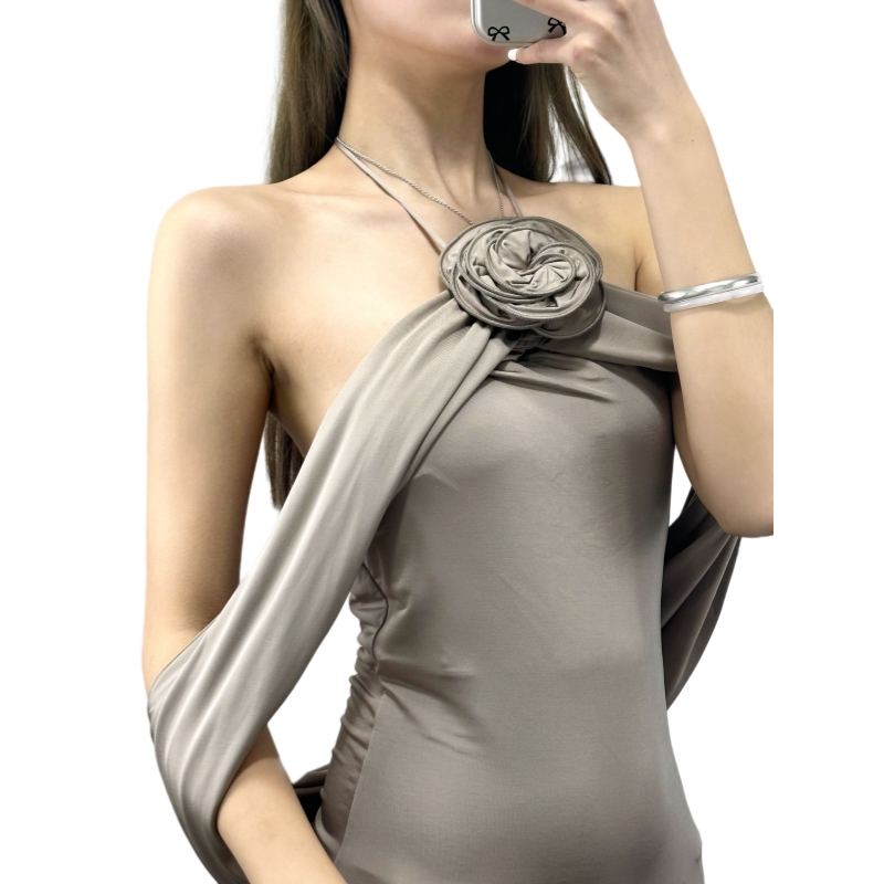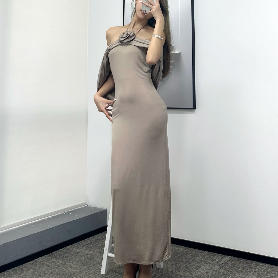Floral-applique Silk Blend Gown Luxury Ready-to-wear Brand Halter Neck Women's Solid Color Sexy Dress Wholesale Women's Clothing