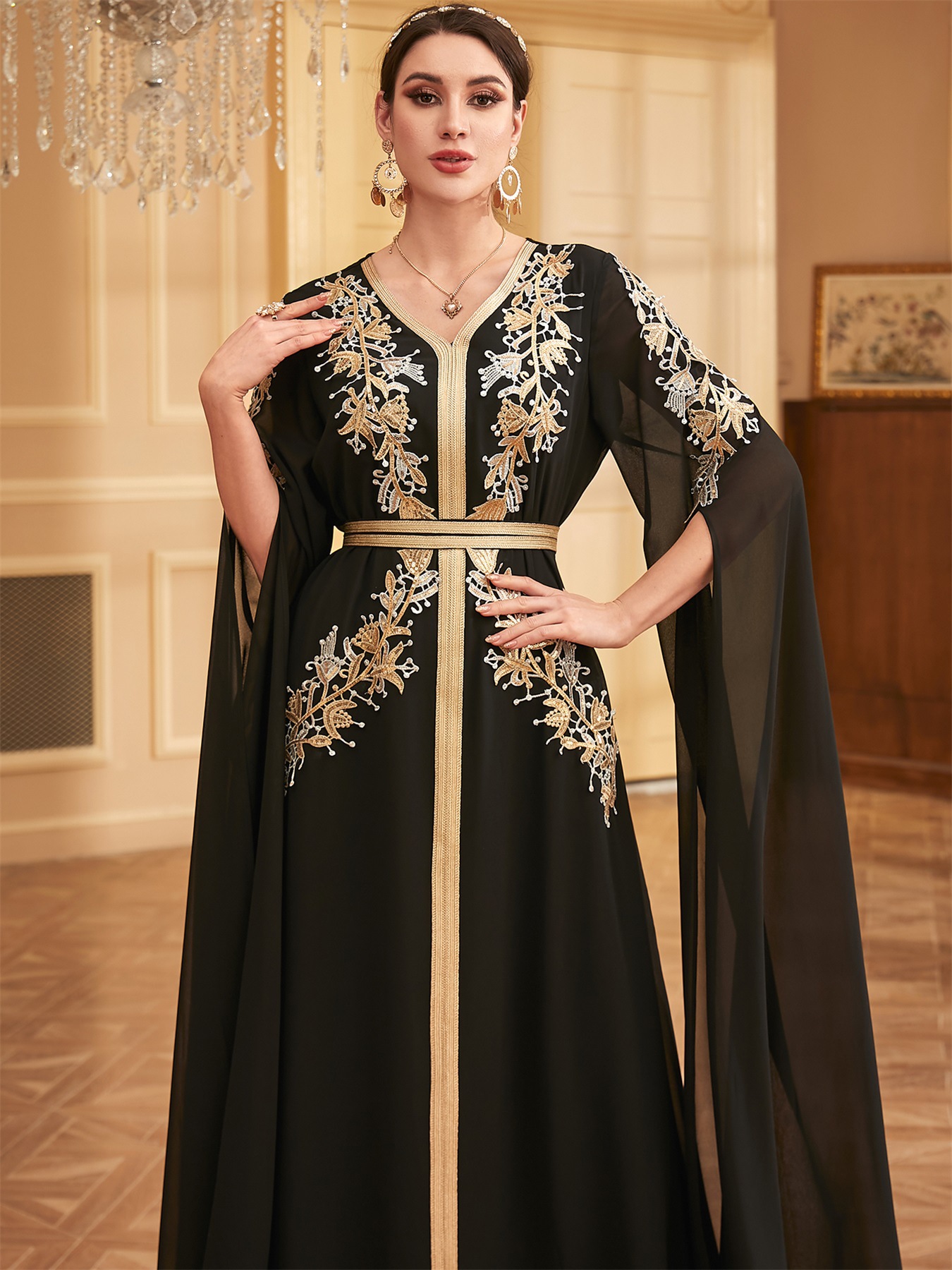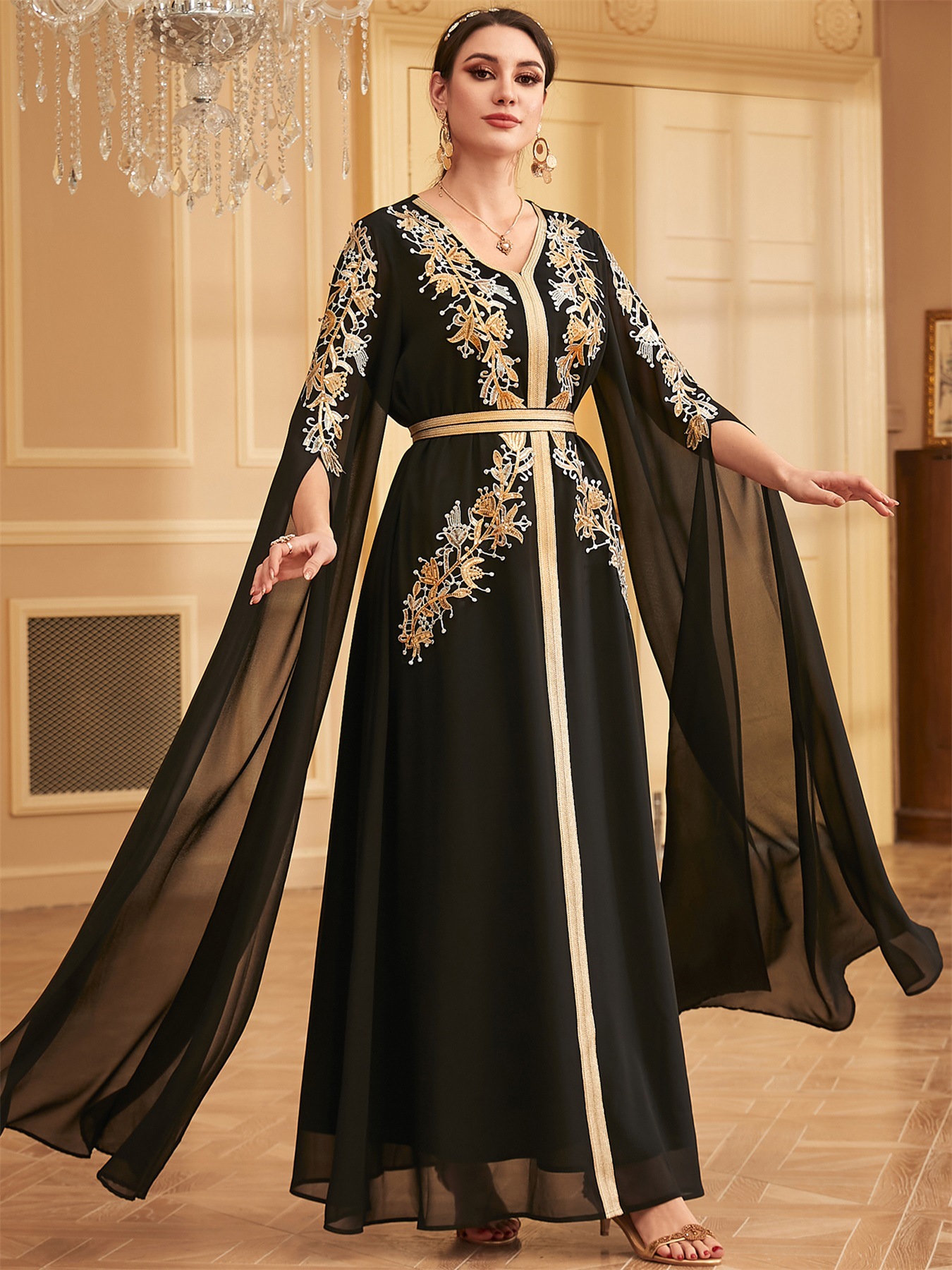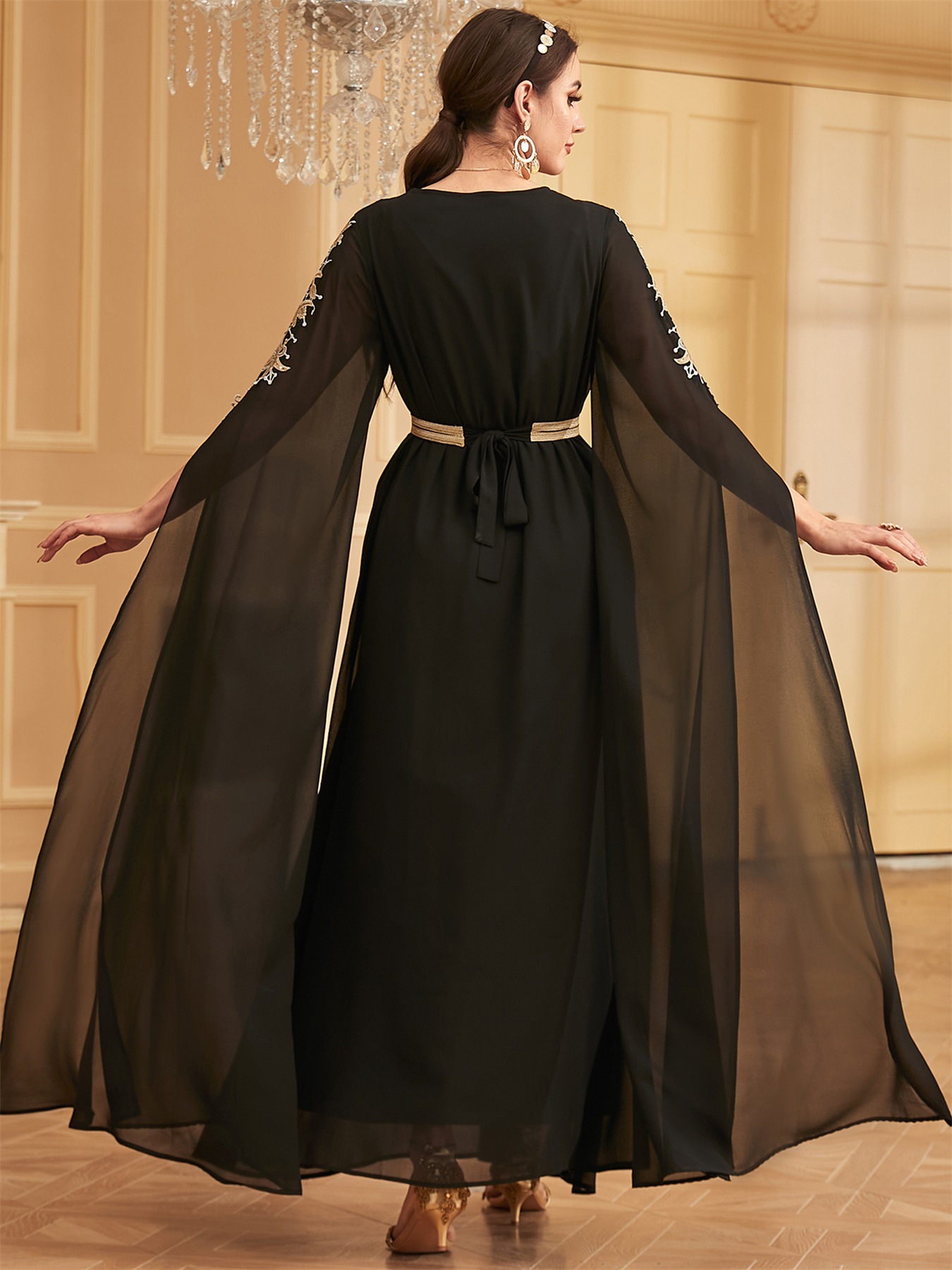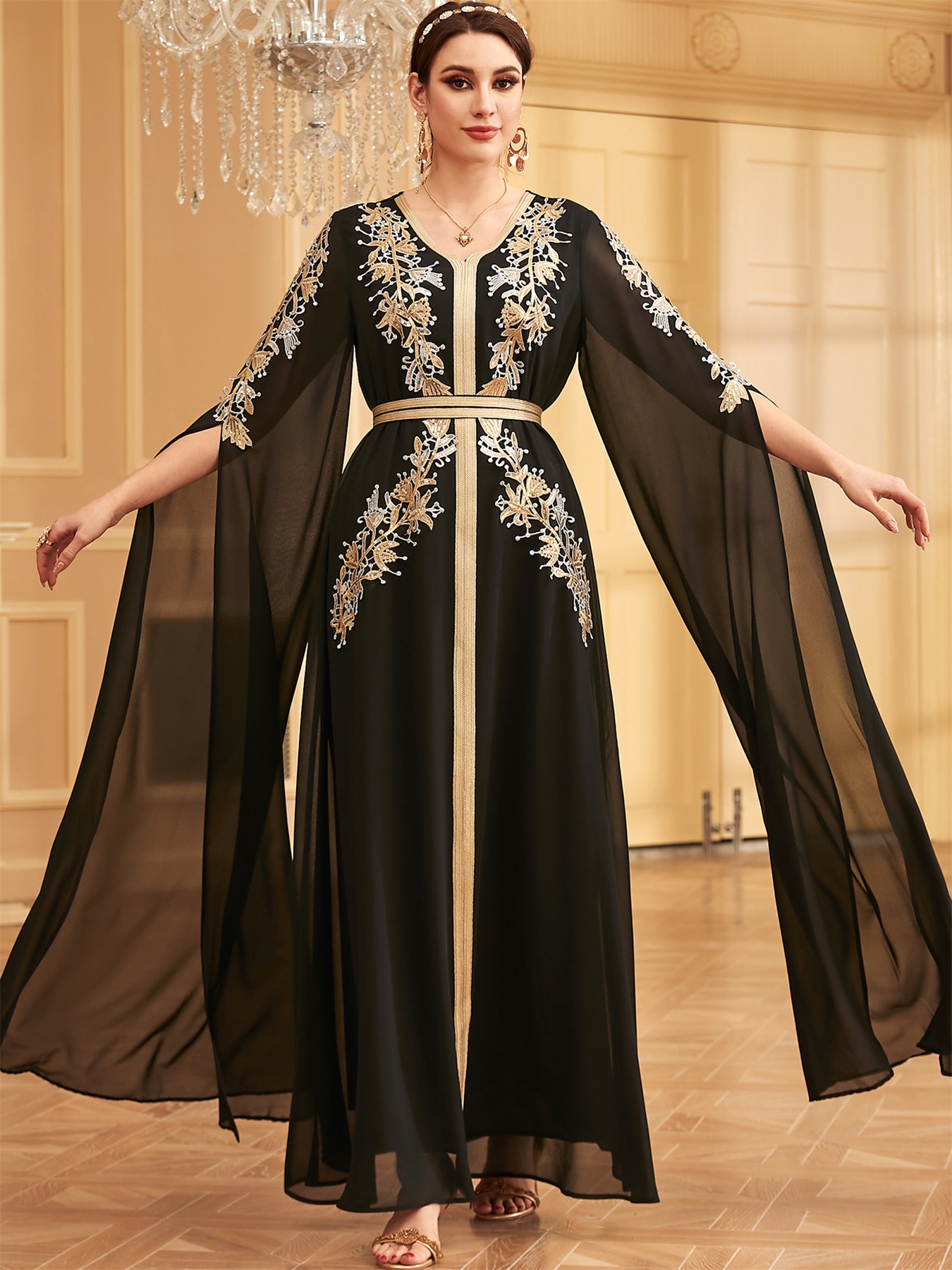 W-70 Middle East Evening Party Muslim Long Dress Dubai Islamic Women's Clothing With Belt Fashion Embroidery Long Sleeve Abaya