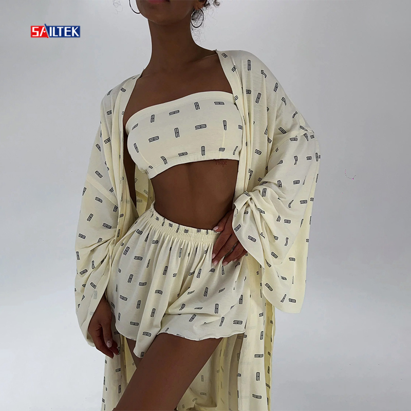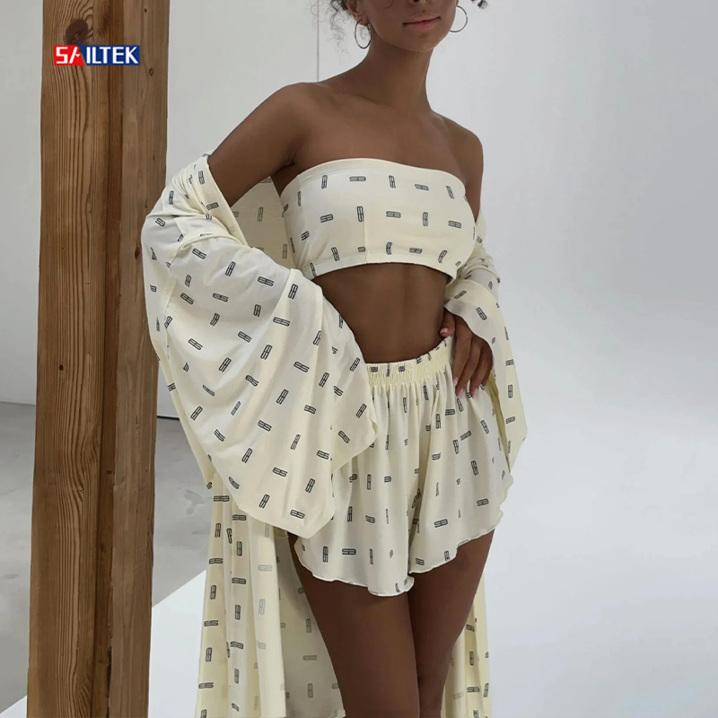 New Fashion 3 Piece Set Women Print Summer Fall 2025 Women's Clothing Custom Ladies Three Piece Robe Tube Top and Shorts Set