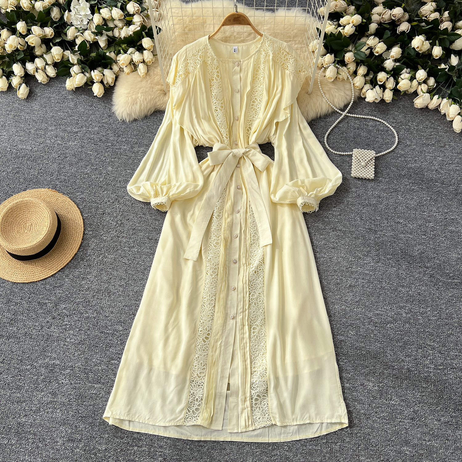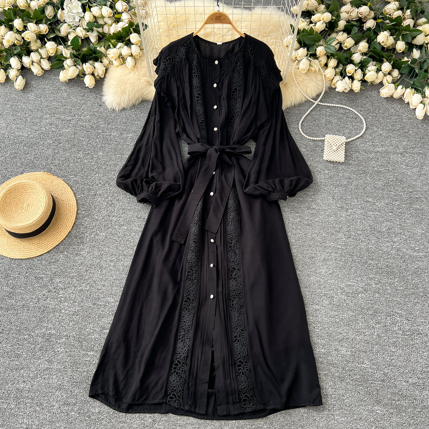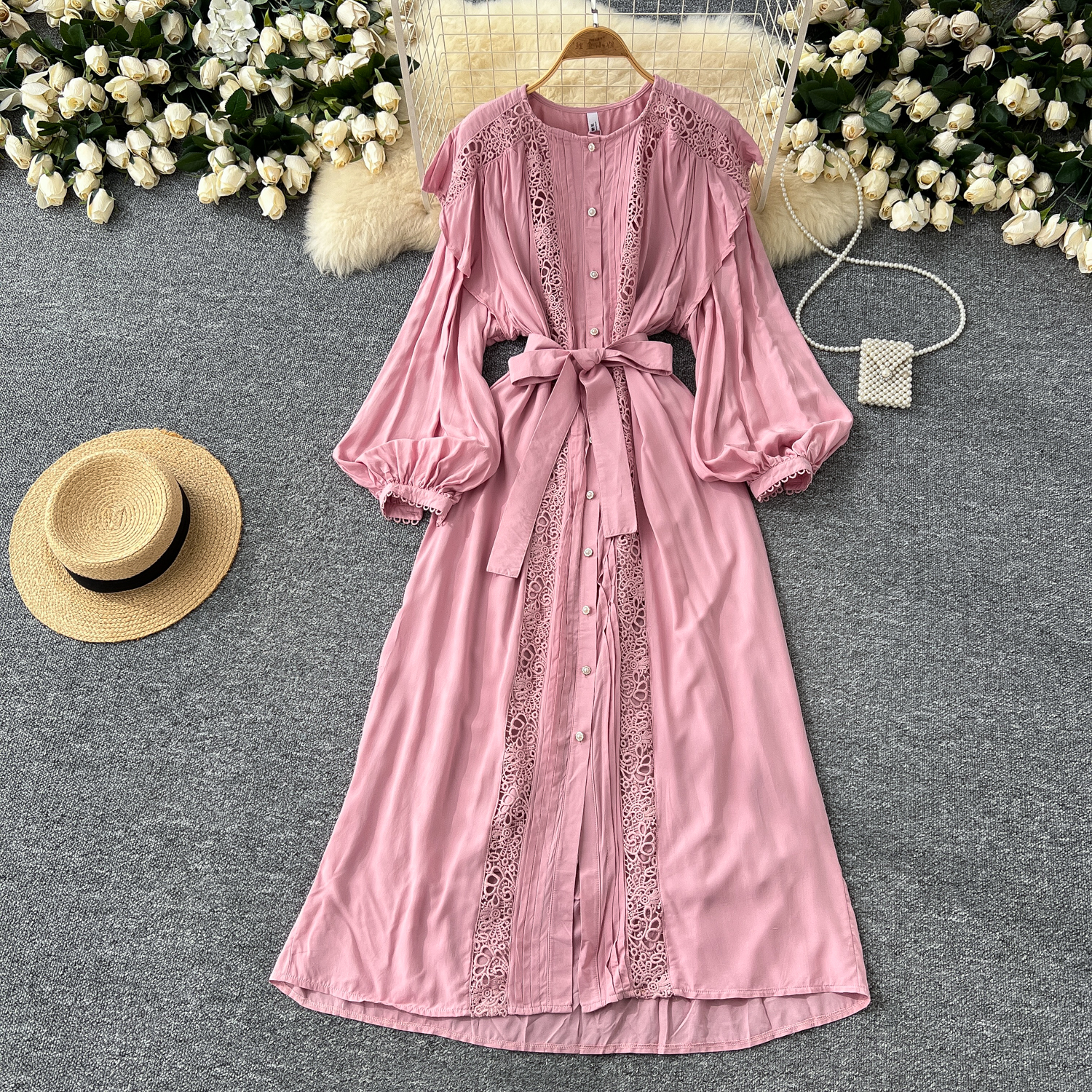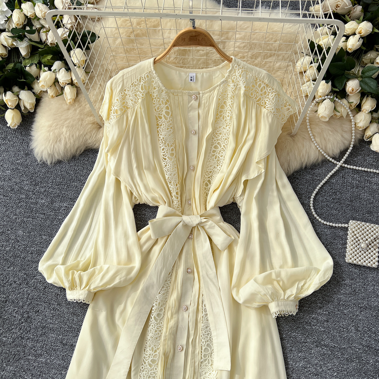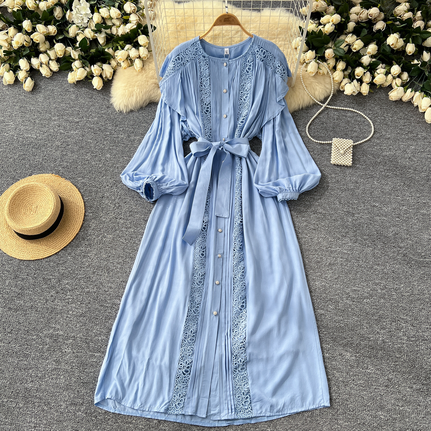 LW0052 French Vintage Hollowed-Out Hook Lace Patchwork Lantern Sleeve Dress Women Tie Waist Temperament Long Dress