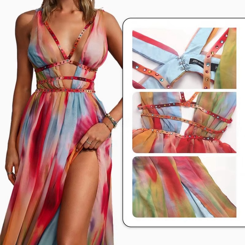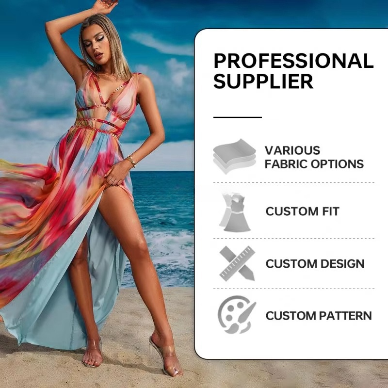 Women V Neck High Silt Printed Maxi Loose Long Summer Casual Beach Dresses 2023 Summer Dress for Women