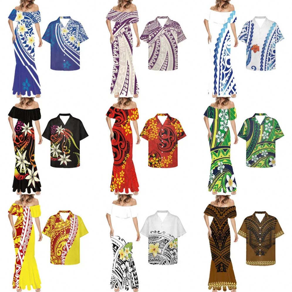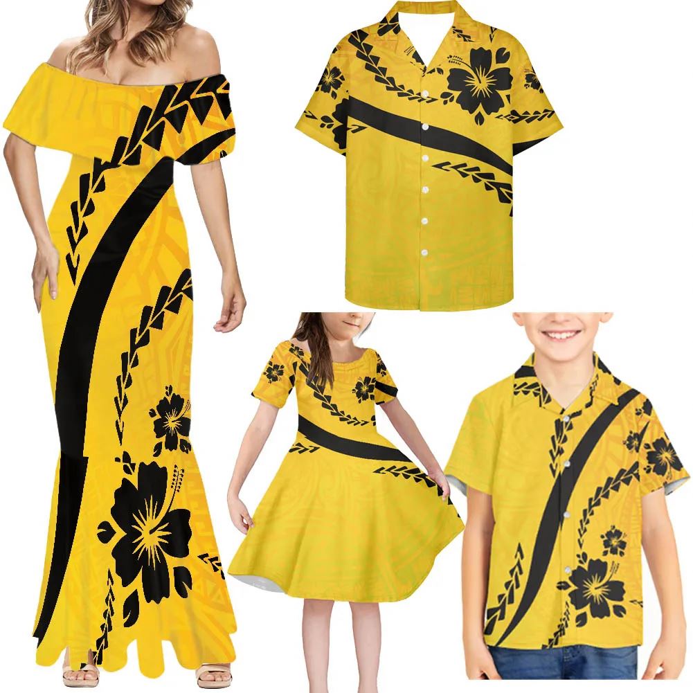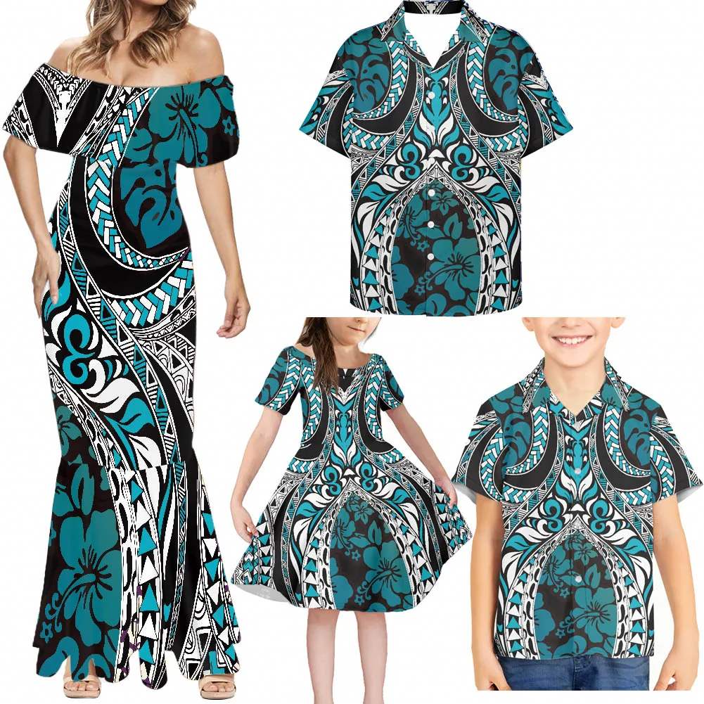 New Polynesian Island 4pcs Family Matching Set Puletasi Style Samoa Custom Women'S Clothing Plus Size Dresses Hawaiian Shirt Man