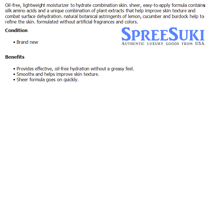 Oil-free, lightweight moisturizer to hydrate combination skin. sheer, easy-to-apply formula contains silk amino acids and a unique combination of plant extracts that help improve skin texture and combat surface dehydration. natural botanical astringents of lemon, cucumber and burdock help to refine the skin. formulated without artificial fragrances and colors.