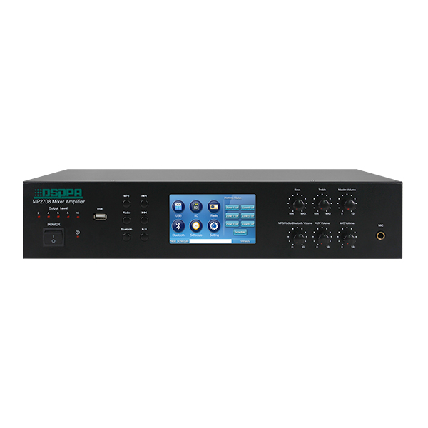 The Integrated Mixer Amplifier MP2708 is a 6 zones mix amplifier integrated with the functions of U disk, SD card, tuner, radio, Bt, zones and timer. With various functions, including song files playing, radio, schedule time etc. Touch screen control, all graphical interface, the operation is very simple and user-friendly. The device can meet the requirements of the users and can be widely applied. This product can be called 6 zone amp or Bt mixer amplifier.