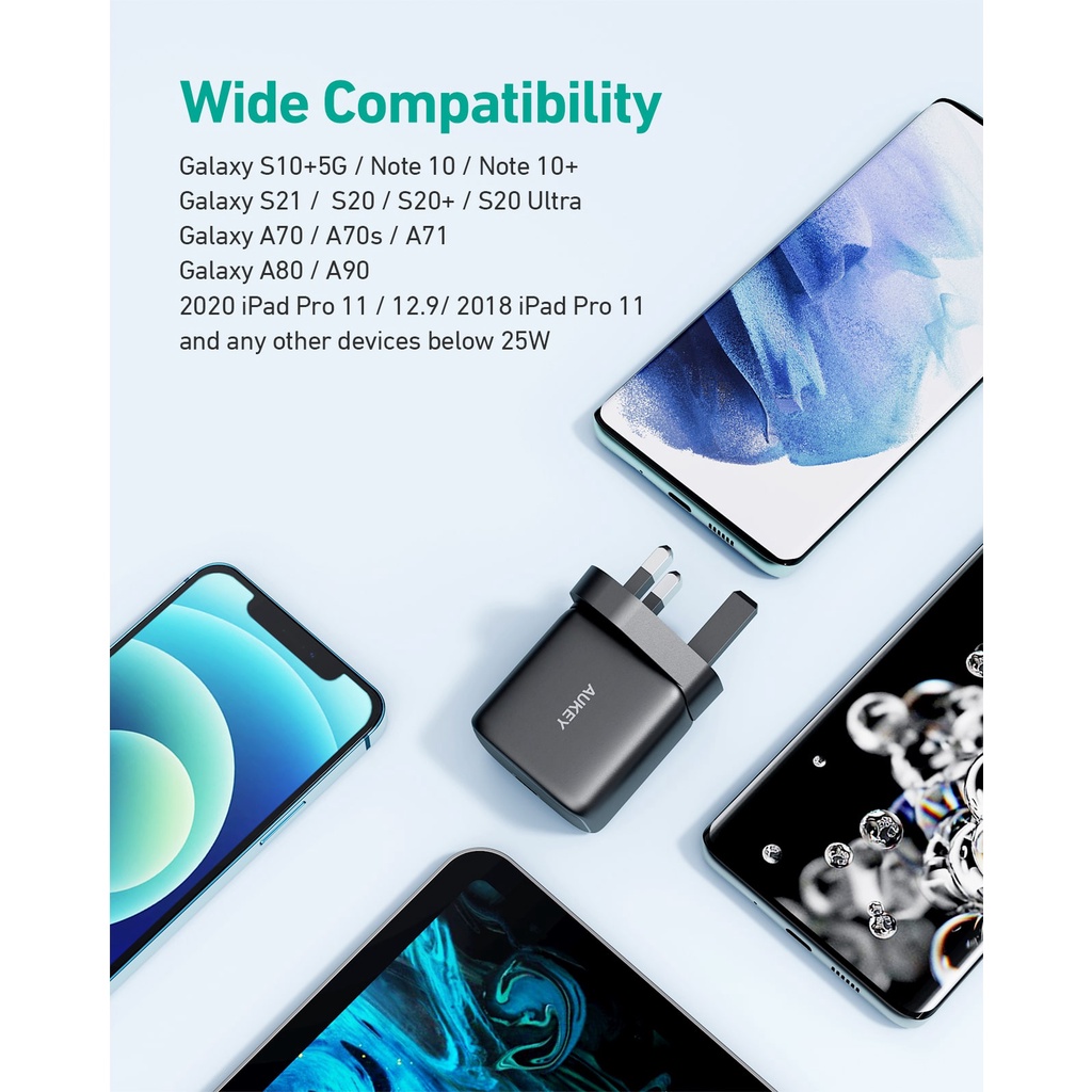 -USB-C with up to 25W Power Delivery efficiently charges compatible devices faster at higher voltages, fast charging the newest phones including Samsung Galaxy phones, iPhone 12 to iPhone 8 Series, MagSafe Duo, iPad Pro, Switch, Earbuds, Smartwatch, and more.