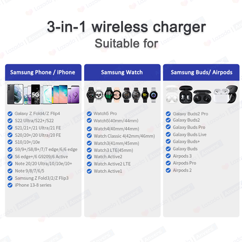 *This3 in 1 charger for samsung support the new Galaxy S22 series, It is a good wireless charger for samsung s22 series which support 15W wireless fast charging for S22/S22+/S22 Ultra and other samsung devices which support 15W wireless fast charging.