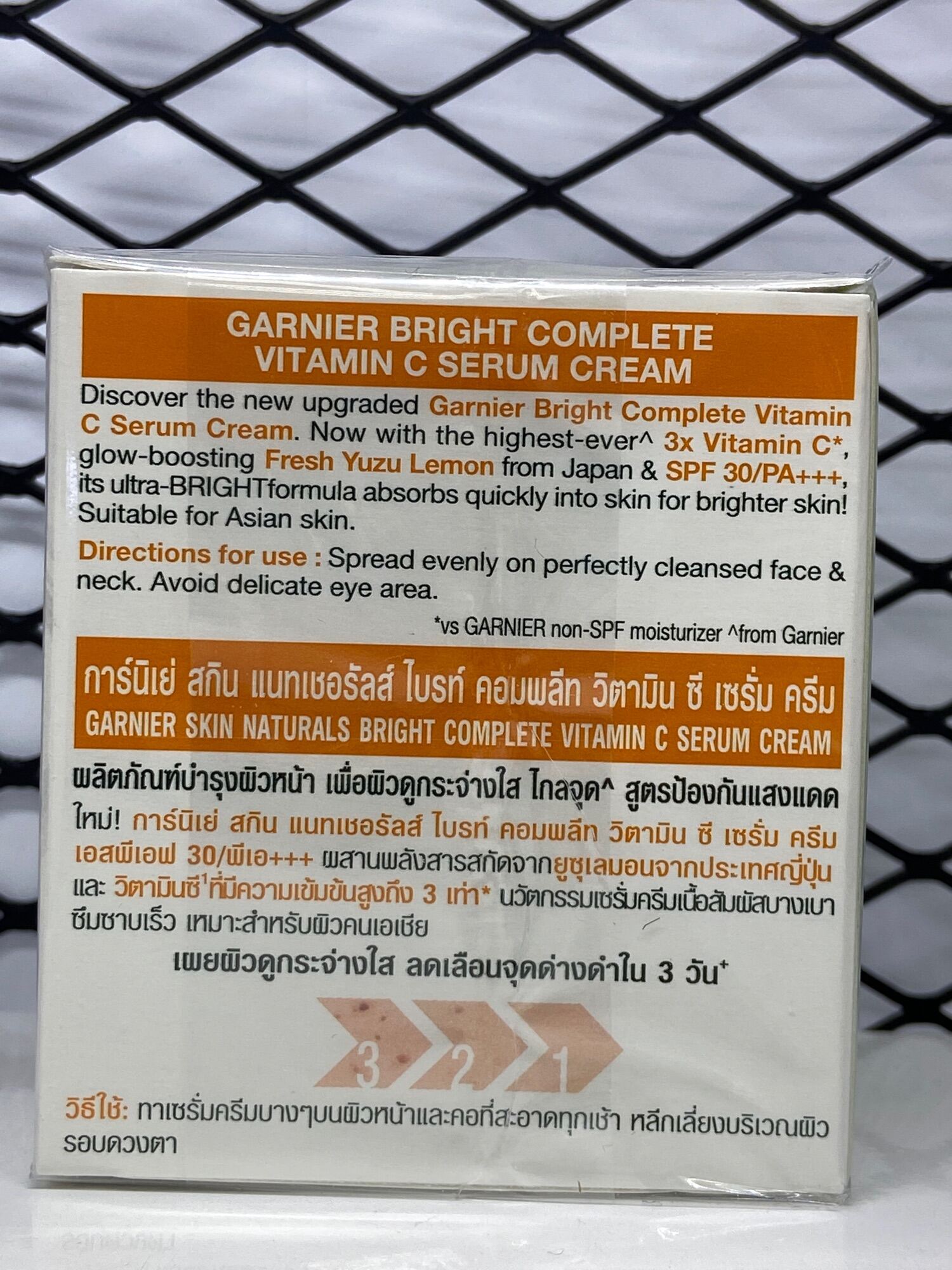 Discover the new upgraded Garnier Bright Complete Vitamin C Serum Cream. Now with the highest ever 3x Vitamin C, glow-boosting Fresh Yuzu Lemon from Japan & SPF30/PA+++, its ultra-BRIGHT formula absorbs quickly into skin for brighter skin! Suitable for Asian skin.