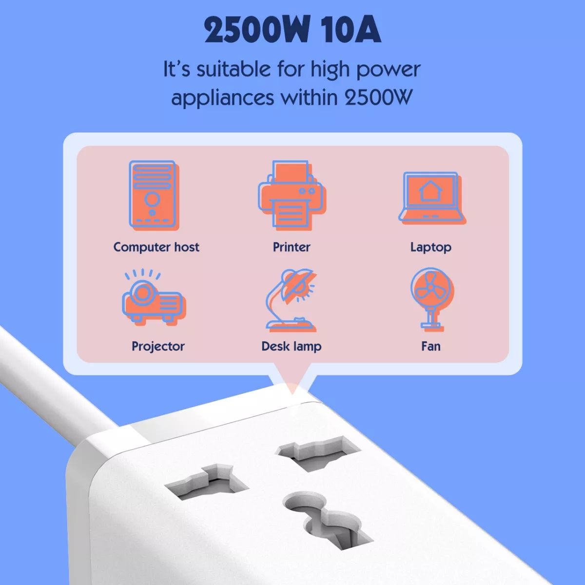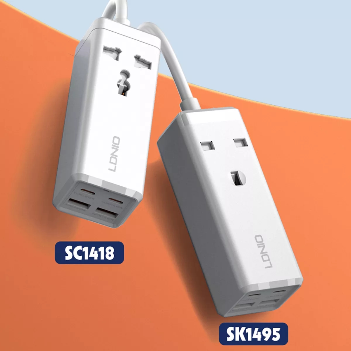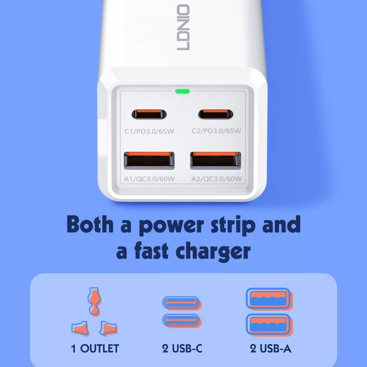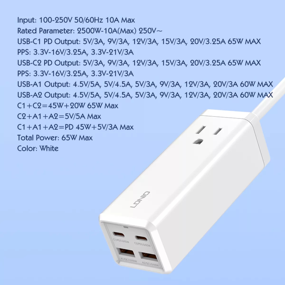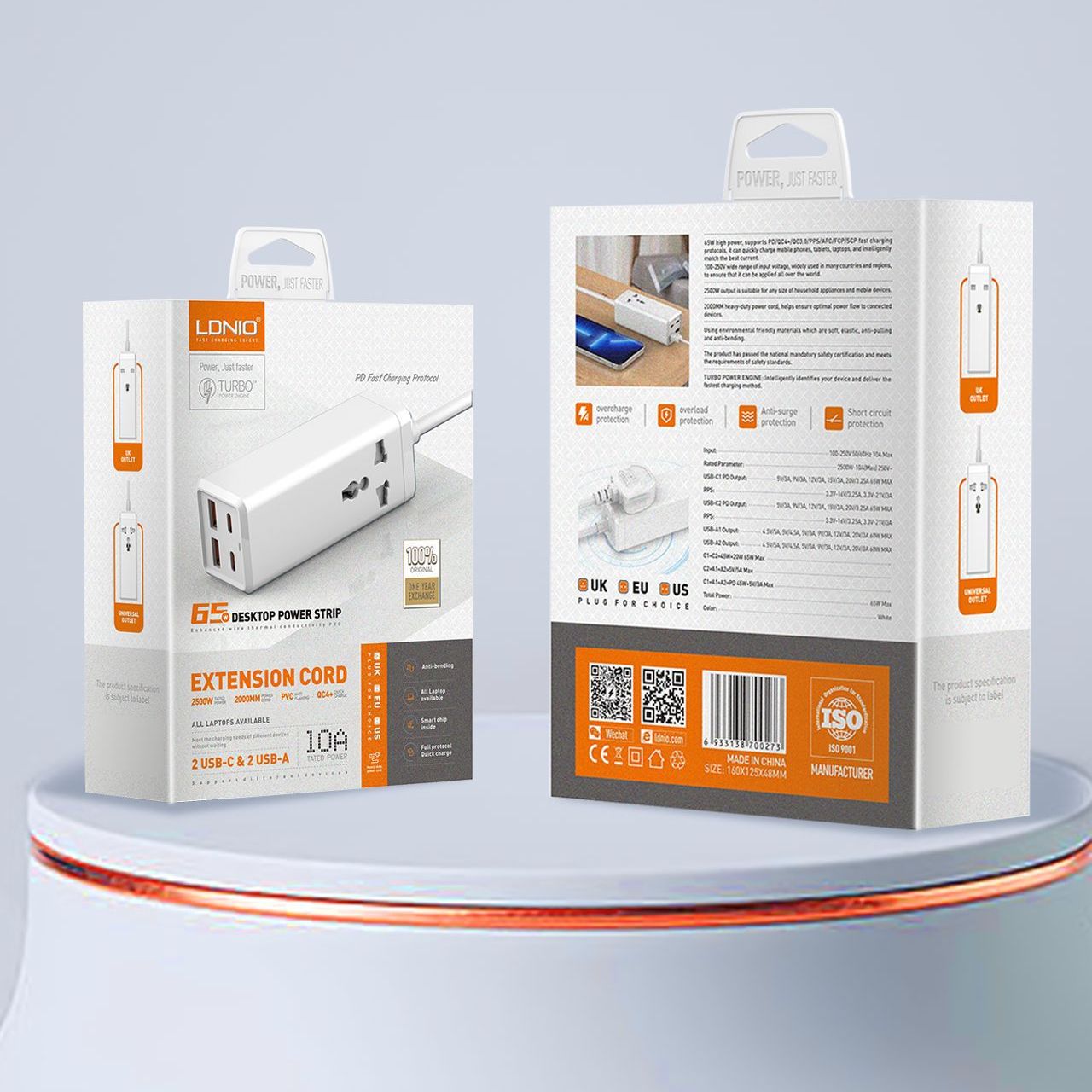 LDNIO 65W MAX USB Wall Charger with Universal Outlet Power Strip Extension Socket with USB C 2500W Travel Adapter Fast Charger PD & QC 3.0 Singapore UK Plug 2 Meter Cable