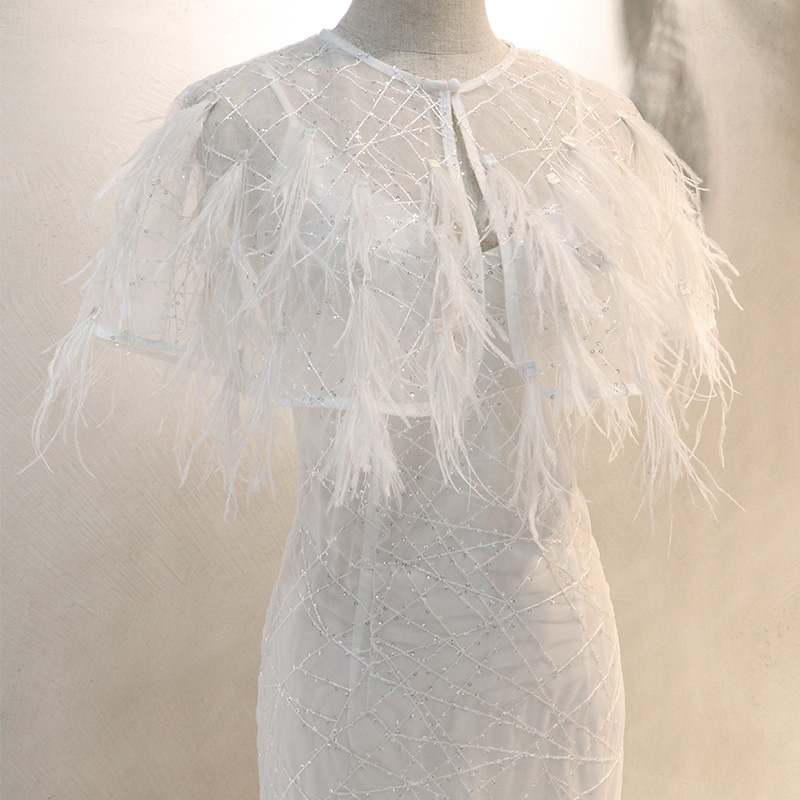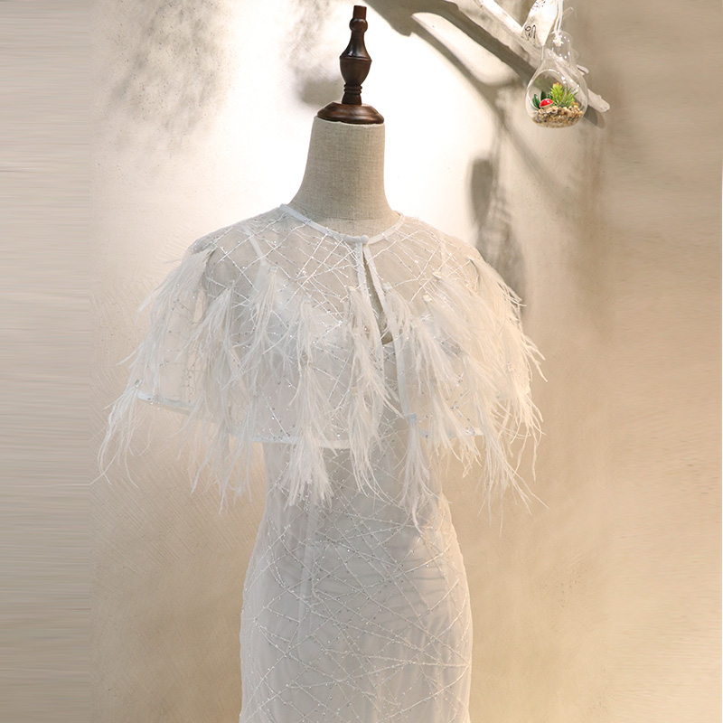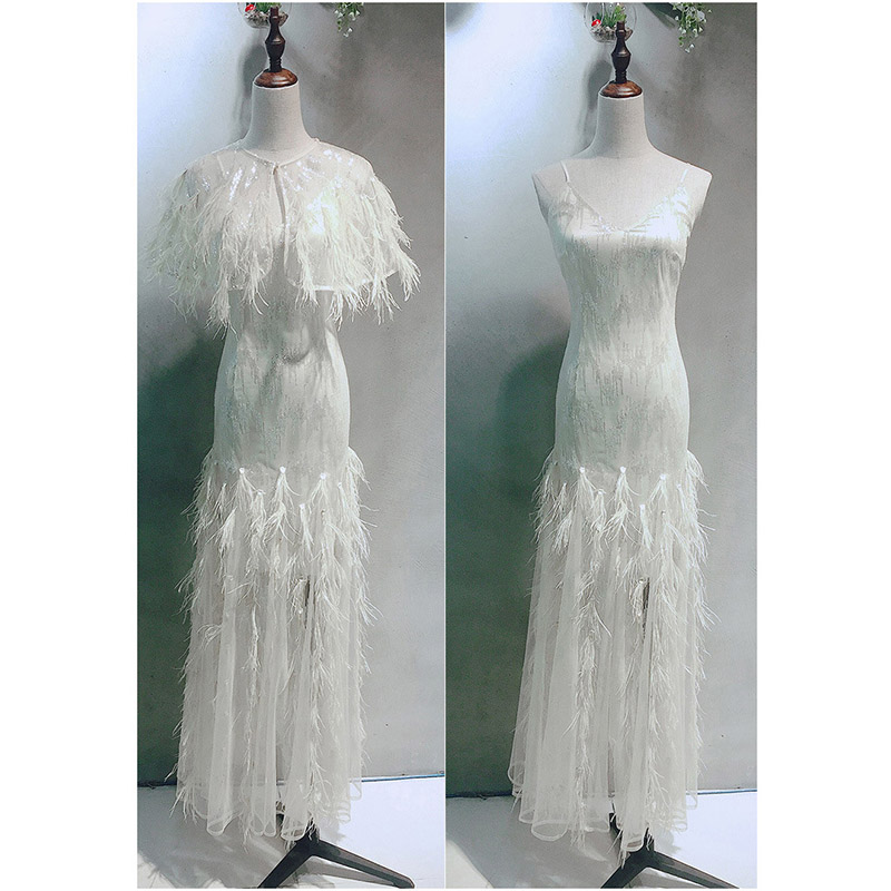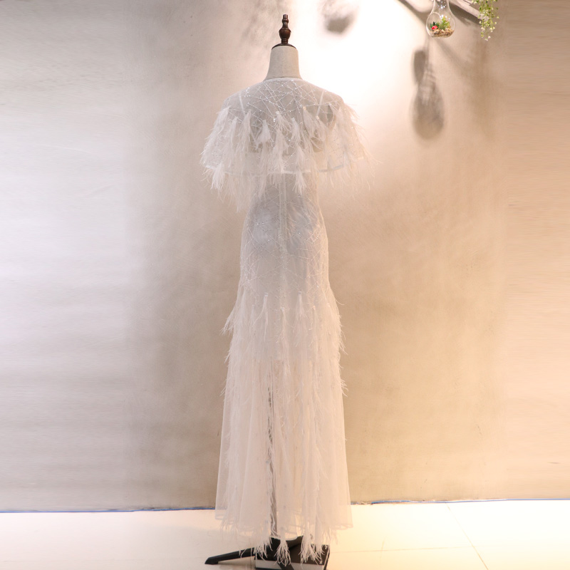 2019 New Fashion Stylish Women Fairy Dress White Ostrich Feather Long Evening Prom Dress with Ostrich Feather Cape