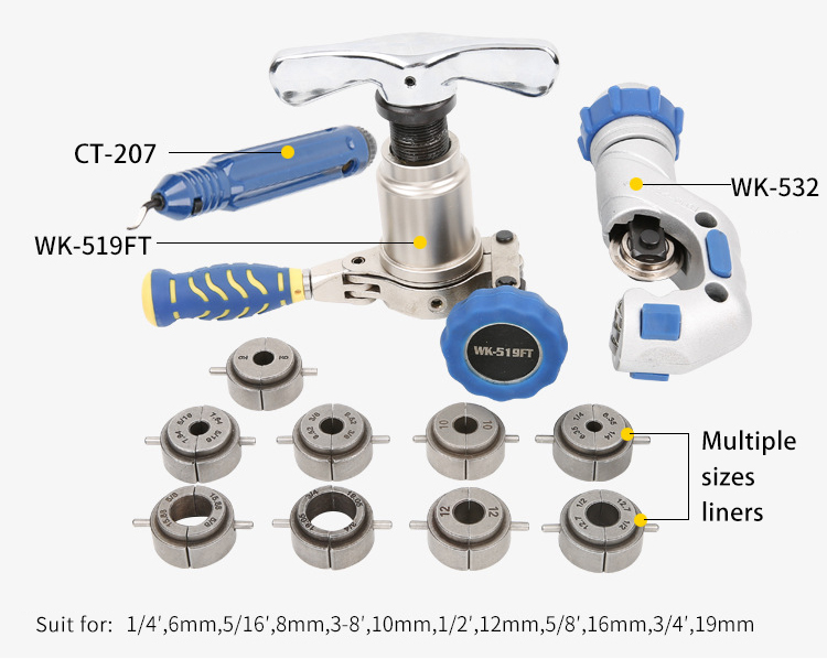 WK-519FT-L | WK-519FT+WK-532+CT-207 | For inch &metric:1/4″,6mm,5/16″(8mm),3/8″,10mm,1/2″,12mm,5/8″(16mm),3/4″(19mm),O.D.Tubing | Packed in hand carrying plastic case. | |