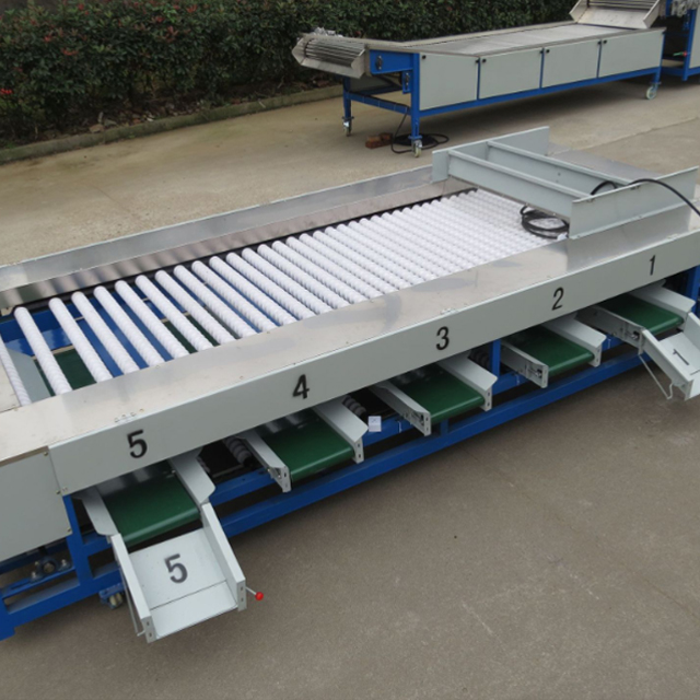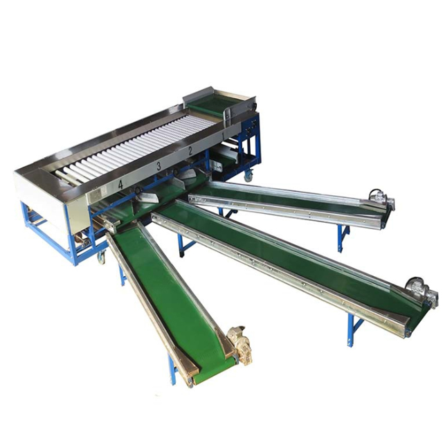 The classifier is driven by the double helix to drive the calabash rod in the grading bed to move in parallel, and the gap between the rolling bars is gradually increased, so that the corresponding size of the fruit and vegetable is achieved, And the gap between the fruit and vegetable from the calabash rod is caused to fall on the fruit-discharging conveyor belt, and the purpose of the fruit selection is finally finished.