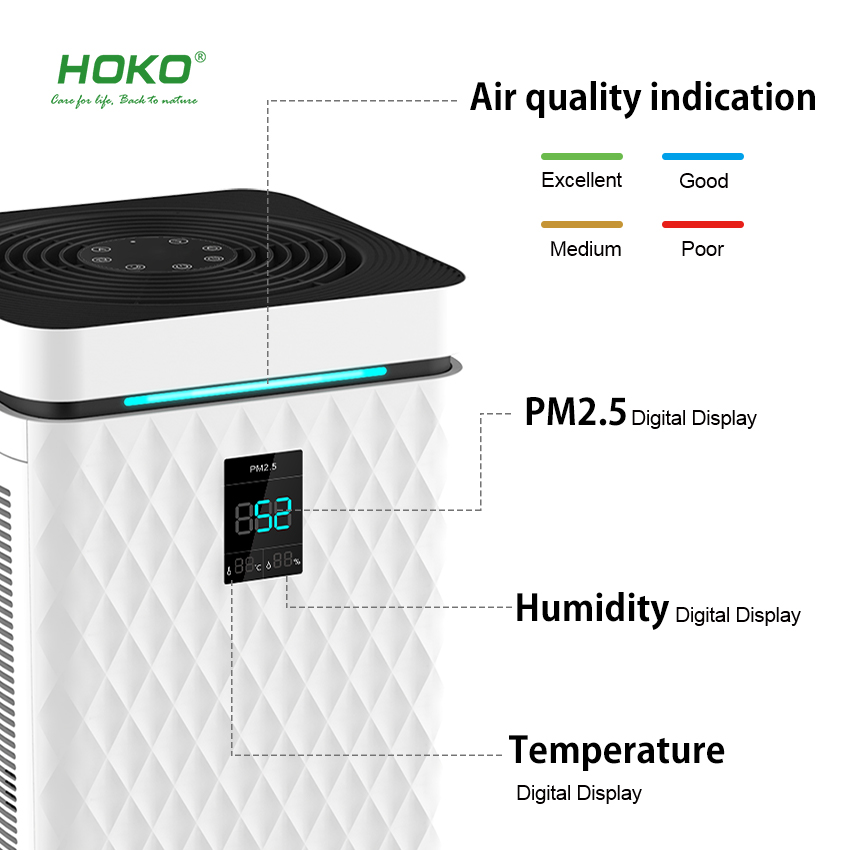 Unit Features | 1. Hot sale air purifier with PM2.5 display for large room 2. Smart Sensor to detect the dust 3. Dual-filter,high efficacy 4. 6 fan speeds 5. High quality HEPA+charcoal Filter |