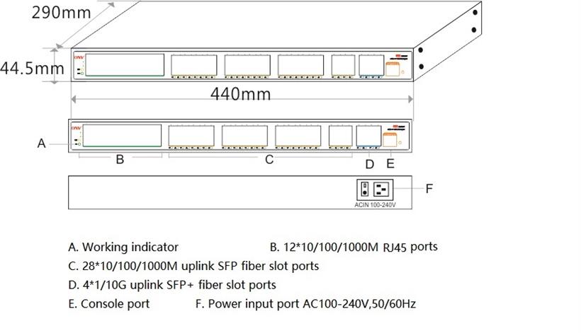 Interface | 8*10/100/1000Base-T PoE ports (Data/Power) 4*10/100/1000Base-T RJ45 ports (Data) 28*100/10001000Base-X SFP fiber slot ports (Data) 4*1/10G uplink SFP+ fiber slot ports (Data) 1*Console RS232 port (115200,N,8,1) | |