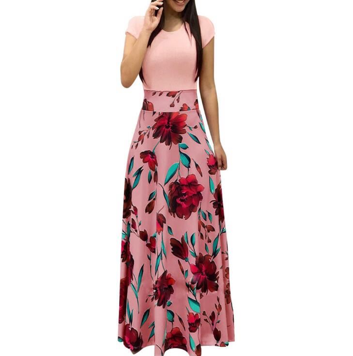 New Fashion Women Short Sleeve Floral Printed Slim Long Style High Waist One-piece Dress Clothing for Women Casual Long Dress
