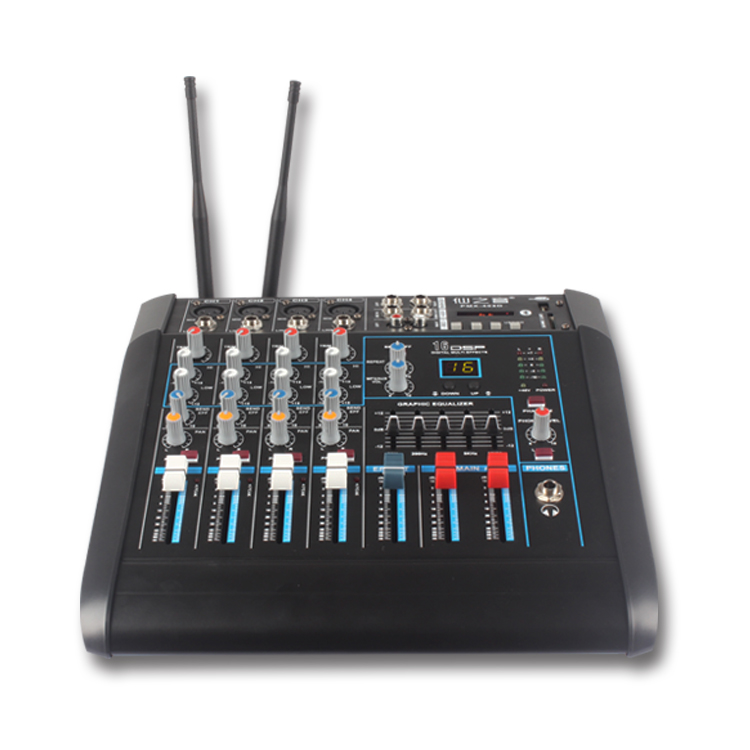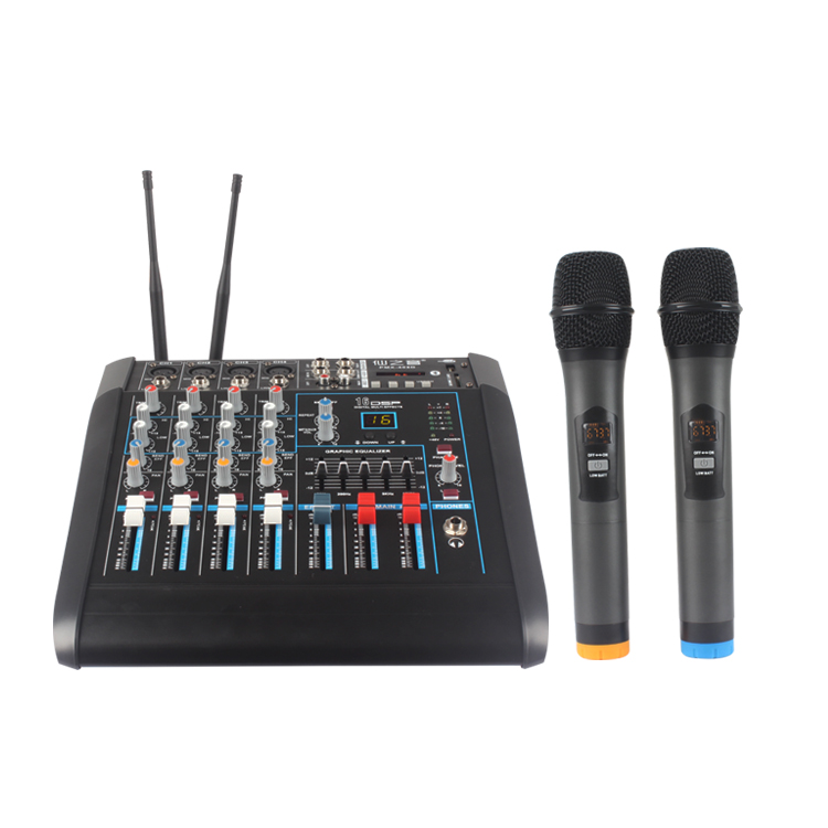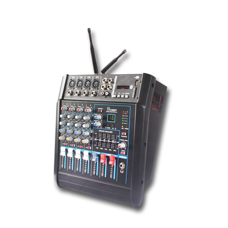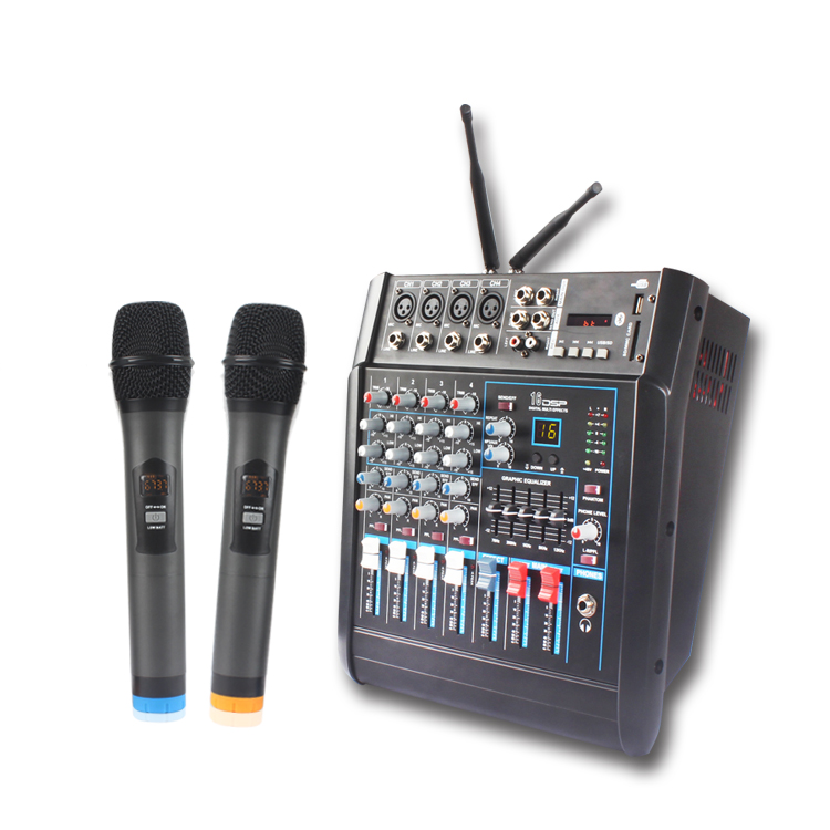 Professional build-in power amplifier 4 channel audio mixer with wireless microphone