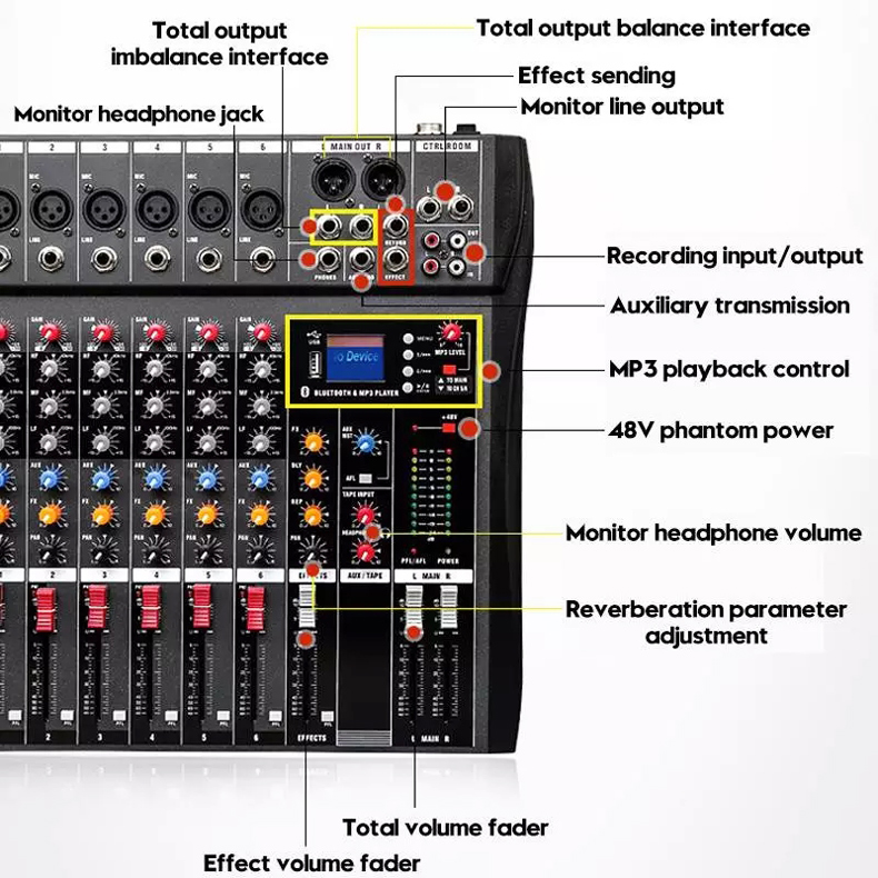 | Mono/stereo channel EQ: | high frequency +/-15dB, 12KHz low frequency +/-15dB, 80KHz high IF +/-15dB, 2.5KHz |
