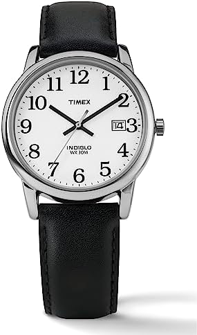 Adjustable black 18 millimeter genuine leather strap fits up to 8-inch wrist circumference White easy-to-read dial with date window at 3 o'clock; Full Arabic numerals Silver-tone 35 millimeter brass case with mineral glass crystal Indiglo light-up watch dial Water resistant to 30 meter (100 feet): In general, withstands splashes or brief immersion in water, but not suitable for swimming or bathing #10,553 in Clothing, Shoes & Jewelry ( ) #22 in