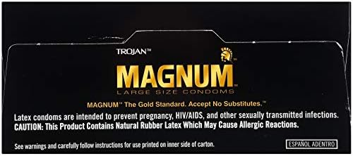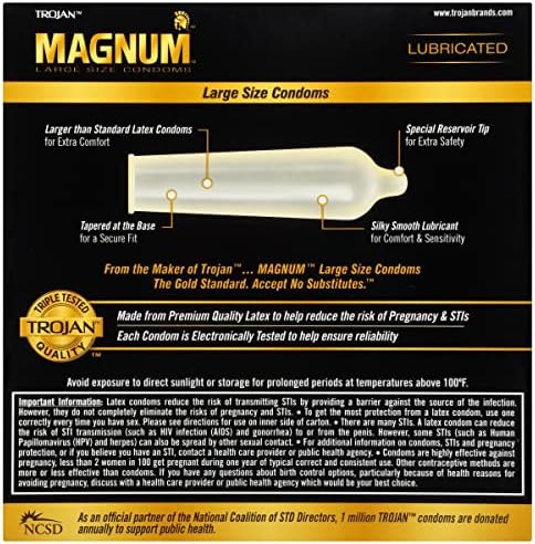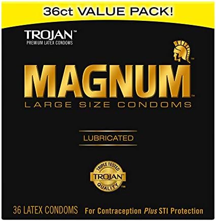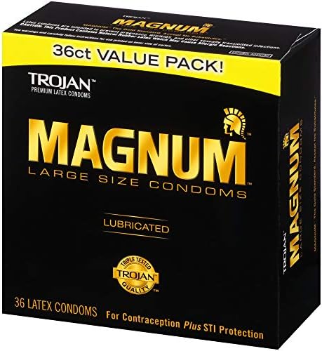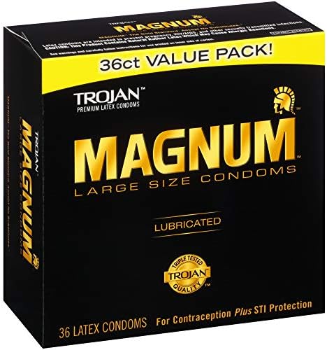 One 36 count box of TROJAN Magnum Lubricated Large Condoms with a contoured shape and silky smooth lubricant for added comfort Magnum Large Condoms are larger than the standard latex condoms with a wider, contoured shape for men who need a little more room, plus a special reservoir tip for extra safety and a tapered base for secure placement Latex condoms feature a silky-smooth lubricant to help provide heightened sensitivity and comfort every time you play These lubricated condoms for men are made from premium latex and electronically tested to help ensure they are reliable contraceptives; TROJAN Brand Condoms reduce the risk of unintended pregnancy and sexually transmitted infections (STIs) TROJAN Brand Condoms are America's Number 1 Condom, trusted for over 100 years; TROJAN promotes a safe, healthy, and fun sex life and is dedicated to delivering innovative, high-quality products that offer pleasure and protection #6 in