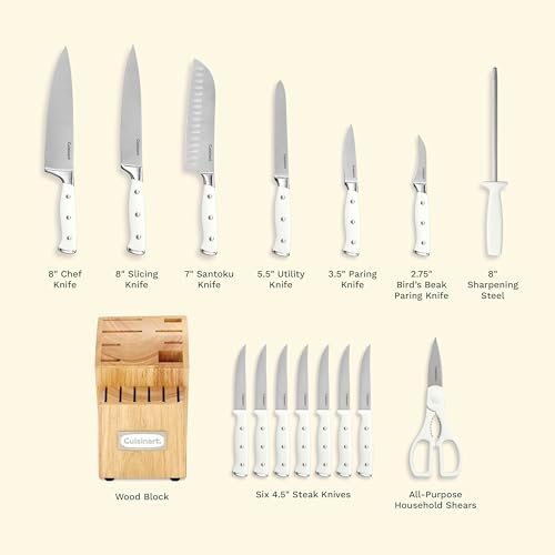 SET INCLUDES: 8-inch Chef Knife, 8-inch Slicing Knife, 7-inch Santoku Knife, 5.5-inch Utility Knife, 3.5-inch Paring Knife, 2.75-inch Bird's Beak Paring Knife, 4.5-inch Steak Knives (6), 8-inch Sharpening Steel, All-Purpose Household Shears and Wooden Block SUPERIOR PERFORMANCE: Cuisinart’s Classic Forged Triple Rivet Cutlery possesses superior high-carbon stainless steel blades for precision and accuracy TOTAL CONTROL: Durable extra-wide safety bolster for perfect stability and control WELL BUILT: Stainless steel rivets to secure the full-tang blade to the ergonomically designed handle LIFETIME WARRANTY: Cuisinart Cutlery is warranted to be free of defects in material and workmanship under normal home use from the date of original purchase throughout the original purchaser’s lifetime. Please see Product Documentation below