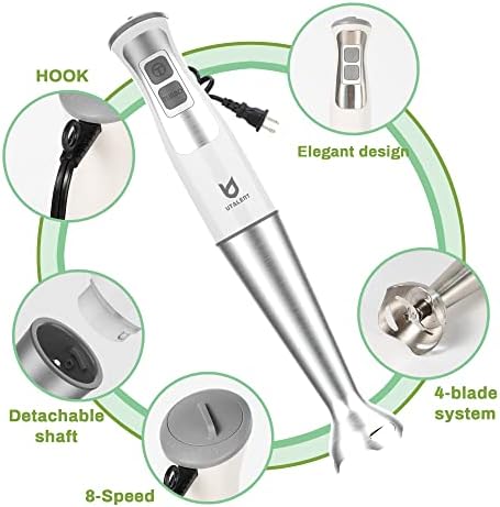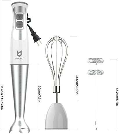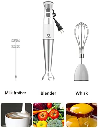 Easy to Clean & Safe: Detachable attachments are easier to clean, chemical free with ETL, dishwasher safe and BPA free Milk Frother Attachment: Portable hand-held milk frother makes milk foam for your coffee More Powerful: The powerful hand blender with 8 - speed + turbo for milk shakes, soups or baby food. Low noise and shake High-Efficiency Blender: Stainless steel mixing wand with 4 - blade system can make food mixing more efficient, evenly and smoothly Three functions : Multifunctional powerful immersion blender with mixing wand, milk frother, egg Whisk