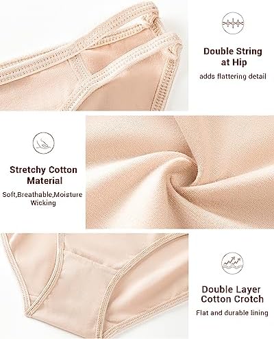 Flattering Bikini Fit: Sexy underwear for women in a string bikini briefs style; Mid rise womens bikini underwear is flattering for curves and gives full coverage of rear; This ladies underwear has double string at the hips and lays flat on the body for a sexy look; With a sassy style, this cute underwear for women will be your new favorite for everyday use Soft And Breatheable: Jo & Bette bikini panties for women have great stretch for a truly comfortable fit; Womens cotton underwear with comfy, soft, breathable elastic waistbands and leg bands for all day wear Do Not Ride Up: These ladies panties fit comfortably and do not ride up; For detailed size information on this women underwear, see the size chart in photos; Jo & Bette women panties range from size 5 to 9 Solid And Neutral Colors: Choose between two womens underwear packs: Solids (1 of each) – pink, beige, blue, teal green, red, black; Neutral Basics – (2) black, (2) white,(1) light gray, (1) medium gray, (2) tan You Receive: (6) Double String Bikini Cotton Panties For Women By Jo & Bette; Choose Color Variety And Size; Underwear For Women Pack New In Retail Packaging #24,971 in Clothing, Shoes & Jewelry ( ) #86 in