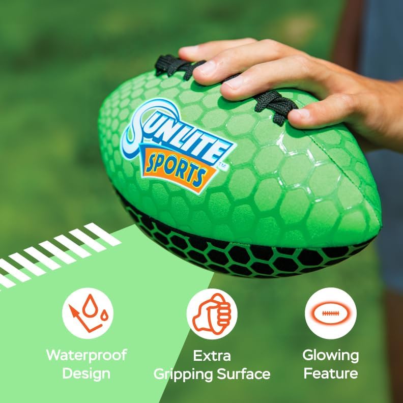 [GLOW IN THE DARK] - Covered in a special coating, this football glows in the dark. PLEASE NOTE: Like a solar battery, this football must be “charged” with UV light for several hours in order to properly glow. [PREMIUM CONSTRUCTION] - Made from durable neoprene, this puncture-resistant football is perfect for pool or backyard play. Avoid concrete surfaces for longevity. [FUN TIME FOR ALL] - With a length of 9 inches, the football can be thrown by both children and adults. Get some exercise while having a great time with your loved ones. [WATERPROOF] - 100% waterproof and chlorine-resistant, making it a perfect addition to pool games. [EASY TO GRIP] - 4-inch finger laces and a rubberized surface ensure a secure grip and accurate throws. NOTE: Arrives uninflated for easy packing and quickly inflates with the included travel-size pump.