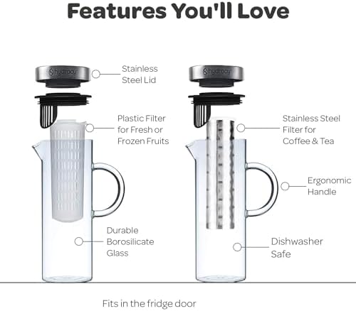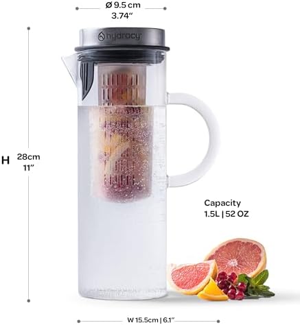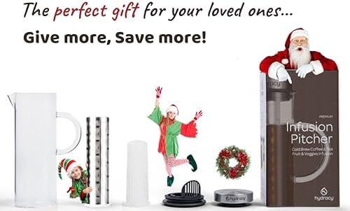 ✅ MAKE YOUR OWN COLD BREW AT HOME! Use the fine mesh of the pitcher to cold brew your favorite coffee or tea and create your own version easily at home. Best result with coarse coffee grounds for Smoother Less Acidic Coffee. Want to get fancier? Just add mint or lemon in the mesh of your usual cold brew preparation or fill your extra fruit infuser tube with some fruits and veggies for a deliciously refreshing infusion packed with vitamins & nutrients. ✅ SIMPLY STUNNING: Not only this pitcher is extremely convenient for everyday use but it has also been designed with aesthetics in mind: its elegant slender frame and its stainless steel lid emphasize its premium look and feel. This striking pitcher will get you plenty of compliments and will stands out on every social occasion. ✅ CONVENIENT: Large capacity up to 1.6 Quarts (52oz) when used as a carafe, yet it also fits even in the most crowded refrigerator doors thanks to its slender shape. Dishwasher safe and BPA free, it has been designed for extensive daily usage. Leak proof but also mess proof, thanks to its pour spout and the stainless steel lid you will not spill any of the delicious infusion you prepared. ✅ PREMIUM QUALITY: Your Hydracy pitcher will look striking on your table, and also its high quality will make it pass the test of time. The body is made of borosilicate glass which is lighter and stronger than standard glass but also thermo resistant to high and low temperatures. The infuser basket and mesh are food grade BPA-free plastic while the lid is made of anti corrosion stainless steel. Delivered in an elegant packaging, this could be the perfect gift for your loved ones! ★ YOUR SATISFACTION GUARANTEED ★ We are so sure you will absolutely love your pitcher that it comes with a lifetime satisfaction guaranteed: if for whatever reason you are not absolutely 100% thrilled by your infuser, we will refund or replace it, no question asked! Included also are instructions on how to download your free Infused Water Starter Guide & Recipes eBook. Get yourself a gorgeous pitcher and enjoy your new healthy drinking options risk-free NOW!