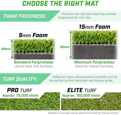 ELITE TURF: Our commercial grade synthetic turf is designed to feel and perform like real grass turf while providing for extended longevity; Withstands approximately 150,000 shots 5 x 4 FT SIZE: Designed for right and left handed golfers of all abilities with 6 different teeing positions to work for your full set of clubs; Includes 3 rubber tees 15 mm MAT THICKNESS: Premium non-slip foam backing provides maximum forgiveness for mis-hits; Extra foam thickness makes it great for uneven surfaces DESIGNED BY GOLFERS FOR GOLFERS: Designed & tested in the US by golfers of all handicaps to ensure they meet GoSports standards; Beware of low cost off brand alternatives that use sub-par materials that look good in pictures but will fall apart over time CHOOSE YOUR MAT: Available in multiple sizes and foam thickness to accommodate any golfer; Refer to our chart to choose the right mat for you