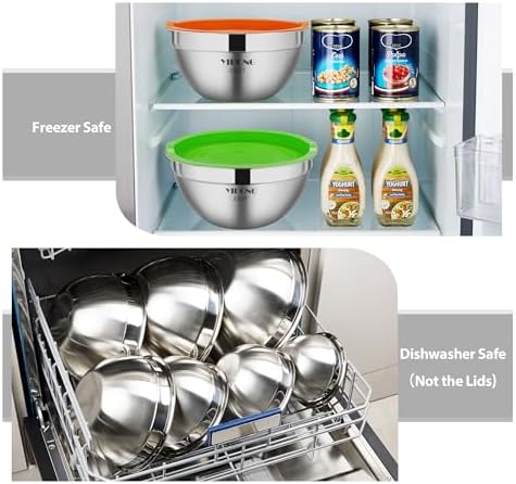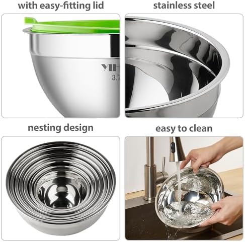 Make Your Cooking Much Easier — YIHONG mixing bowl set contains 7 piece bowls with lids (4.5, 3.6, 2.7, 2.1, 1.7, 1.1, 0.7Qt) that will complement your cooking and make cooking much easier. Ideal for making a quick salad, preparing food, or storing and serving food. Multi-use to Meet You Needs — This mixing bowl with lids set is perfect for everyday use on your home table, they are ideal for serving or even as storage bowls, or ingredient bowls Nesting and Stackable — Easily nest in each other, so you can save space on the countertop, also they can easy storage stack on top of each other, keep them in a spot in the corner of your kitchen, and easily access your food items. Durable Material — Each mixing bowl is made of high-quality stainless steel for lasting use, which is resistant and rustproof. These mixing bowls are dishwasher safe, it is more convenient for you and your family. Dishwasher Safe & Easy Clean — YIHONG mixing bowls are not only easy to clean by hand, they are also dishwasher safe. NOTE: Please hand wash the lids.