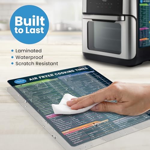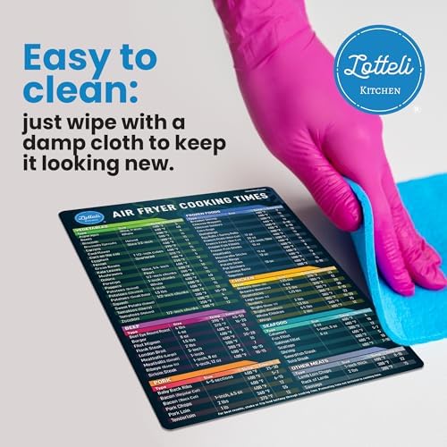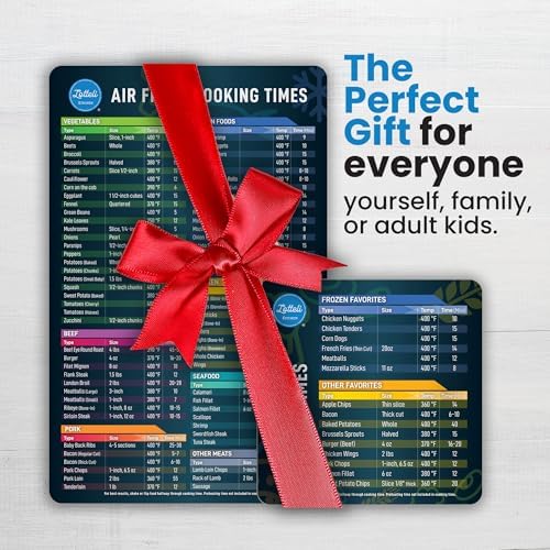 AIR FRYER MAGNET: This Air fryer times and temp guide magnet is carefully crafted with waterproof, oil-resistant, and tear-proof materials, our cheat sheet is built to last. The sturdy Big Magnet (10.5 x 6.5") and Small Magnet (5 x 5") securely attaches to your fridge or any magnetic surface. AIR FRYING MADE EASY: These cool kitchen gadgets come with 2 cooking essential magnetic cheat sheets made for air fryers that show the Cooking Time, Temperature, and Portion of food to take the guesswork out of cooking, so you don’t have to waste time looking things up. This makes for a great air fryer cookbook for beginners. LARGER font is printed on the small magnet with your most popular Frozen Foods for even easier referencing. Makes a thoughtful gift for all occasions. QUALITY AIR FRYER ACCESSORIES: Regardless of what brand air fryer you have, our air fryer cheat sheet is meticulously designed to be universally compatible. It’s a thoughtful addition to any kitchen and the perfect gift for friends, family, or anyone looking to enhance their air frying skills. AIR FRYER COOKING GUIDE: Get ready to cook with confidence! This air fryer magnetic cheat sheet set includes precise cooking times and temperatures for over 100 foods across multiple categories, including vegetables, meats, seafood, frozen foods, and desserts. CLEAR CLASSIFICATION: Our air fryer cooking times chart magnet feature over 100 most common foods including Vegetables, Frozen Foods, Beef, Chicken, etc. that are properly classified magnetic air fryer cheat sheet labeled to make sure you can read them at a glance. This kitchen accessories gadgets make the perfect addition for all gifting occasions. They are tiktok kitchen must haves. PERFECT HOUSEWARMING GIFT: Presented in attractive packaging, our air fryer cheat sheet magnet is a thoughtful gift for anyone who loves to cook. Perfect for anyone, Lotteli makes cooking easier and more enjoyable for both experienced chefs and beginners alike.