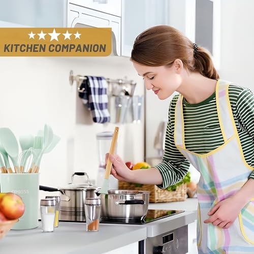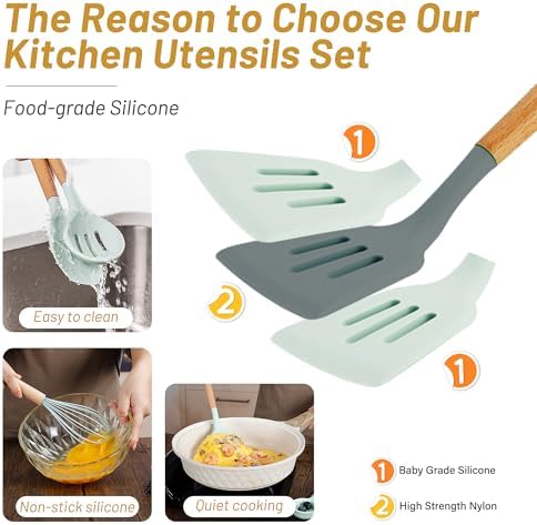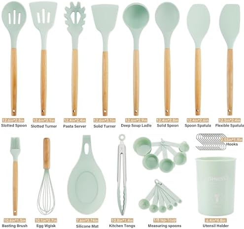 BPA FREE, FOOD GRADE SILICONE: Silicone kitchen utensils are made of food-grade silicone, which is BPA-free and can be used to prepare any type of food. These cooking utensils set will not react with food or beverages, even at high temperatures, and will not retain odors or colors like plastic cookware. Note: The original odor will disappear after soaking the silicone in water and exposing it to air for about 3 hours before first use DURABLE AND HEAT RESISTANT: One of the best things about silicone cooking utensils is that they are super heat resistant, up to 446°F, ensuring that they won't melt or produce smoke even when frying at high temperatures (or left in a pan for a while). The soft silicone won't scratch non-stick cookware or expensive pans. They are perfect for extending the life of your kitchen pans KITCHEN UTENSIL SET WITH HOLDER: This 35-piece kitchen utensil set contains all the kitchen items you need for everyday use, such as a slotted spatula, slotted spoon, turner, soft spatula, pasta mixer, kitchen tongs, whisk, measuring cups and spoons. Lets you put your cooking skills to good use. This means you don't have to spend extra money on duplicate cookware tools, it's the perfect starter set for apartments HIGH QUALITY WOODEN HANDLES: The cooking utensils set handles are made of solid wood with anti-scald function. Smooth and comfortable to the touch, won't bend or rust, stronger than other ordinary wooden cookware, ensuring no wear and tear even after long hours of daily use. Please note that the color and texture of each wooden handle is slightly different due to the solid wood handles GREAT VALUE GIFT SET AND FAST AFTER-SALE RESPONSE: This kitchen utensil set contains everything you need to start cooking. It is a great value and adds a touch of color to your kitchen. It is also a great choice for housewarming, Mother's Day, Christmas, Thanksgiving, wedding registry and other gifts. We are committed to providing the highest standard of customer service to every customer. If you have any questions or issues with the product, please don't hesitate to contact us through our Amaz