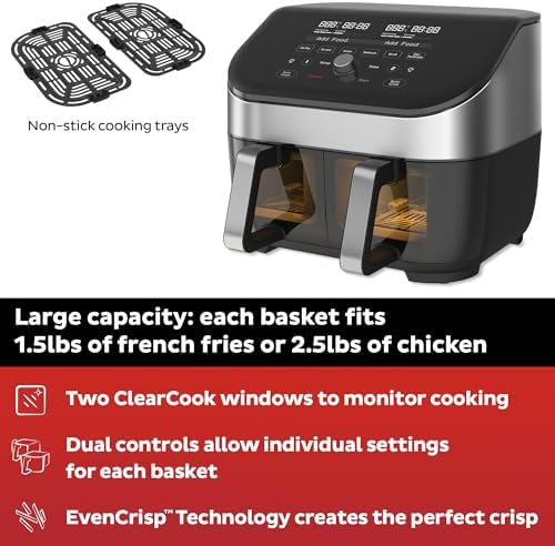 8-IN-1 FUNCTIONALITY: Air fry, roast, broil, bake, reheat, dehydrate, SyncCook and SyncFinish WATCH YOUR FOOD COOK: ClearCook windows and internal light to easily monitor cooking progress without opening the baskets DUAL BASKETS: Save time and eliminate back-to-back cooking like a traditional single-basket air fryer! Dual baskets allows you to cook 2 meals/appetizers, 2 different ways or larger batches! SYNCHRONIZED COOKING: SyncCook lets you cook both baskets with the same cooking settings; SyncFinish lets you program baskets with 2 different settings to automatically finish at the same time! EvenCrisp TECHNOLOGY: Advanced technology that drives air flow from top down for a perfect golden finish and crispy, tender results every time! ONE-TOUCH SMART PROGRAMS: Customizable programs for one-touch wings, roasted veggies, garlicky potatoes, cookies, cinnamon buns and more!Easy to use touchscreen with step-by-step instructions displays each stage of cooking. FAST PREHEATING: Little to no preheating time, from frozen to golden in minutes! Create gourmet meals with the versatility of a temperature range of 95 to 400° F.