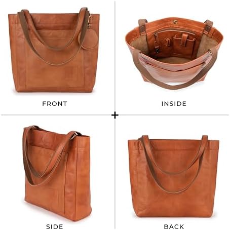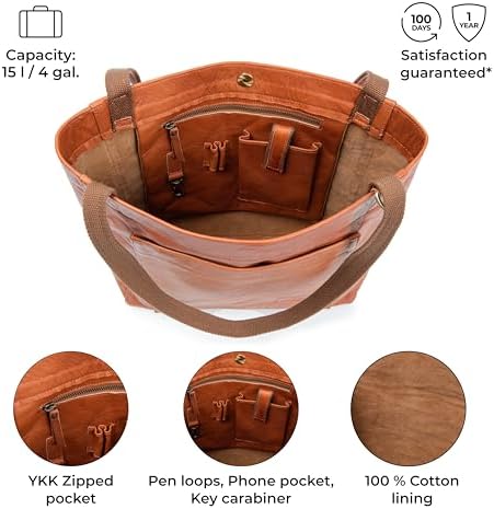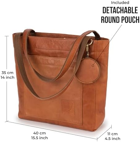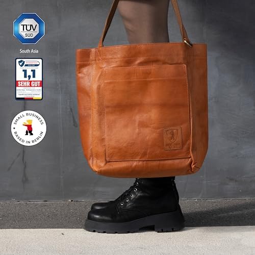 YOUR FOREVER PURSE. Seville is a stylish and roomy women's tote, perfect for everyday use. Its vintage design pairs effortlessly with any outfit. Featuring reinforced leather handles, magnetic closure, detachable round pouch and outside slip-in pocket, it combines style and comfort. Dimensions: 14" x 15.5" x 4.5". DESIGNED IN BERLIN, GERMANY. The versatile Seville handbag is thoughtfully designed in Europe and crafted from high-quality, durable materials, offering both long-lasting wear and timeless style. The spacious main compartment lined with cotton includes a phone pocket, pen loops, a YKK zippered interior pocket, and a key carabiner to keep you organized on the go. MADE TO LAST. We in Berliner Bags believe in quality over quantity. By focusing on fewer, durable, better-made pieces, we extend the life of our bags and reduce waste. Every bag is a lasting investment that brings years of enjoyment. VEGETABLE-TANNED LEATHER. Handcrafted from genuine vegetable-tanned leather, this bag is tanned using natural, chemical-free processes, giving it a one-of-a-kind vintage finish. Certified by TÜV to meet top European standards. SATISFACTION GUARANTEED. Your satisfaction is our number one priority! Every Berliner Bags product comes with a 1-year warranty and a 100-day return policy. (*More details at berliner-bags.com/1year/).
