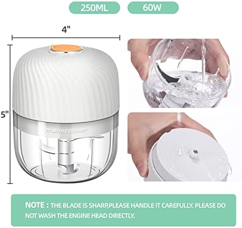 【Easy Use & Powerful】: Product size: 3.94'' * 4.53''. Just manually put food or ingredients into the 60W powerful vegetable chopper, lock the lid and chop food quickly with one button, garlic chopper with 4 stainless steel 304 sharp blades, only needs 20s can automatic and evenly chop/mince/blend a wide variety of foods, saving you time and freeing your hands. 【USB Charging & Portable】: The rechargeable electric garlic chopper supports USB charging, handheld Cordless mincer can be used about 50 times after full charged. This 350ml portable food processor features compact volume, and satisfied the needs when traveling or camping. 【Easy Clean & IPX65 Waterproof】: Our 350ml large capacity food chopper can be rinsed directly with water after use, the blender cup and blade are detachable, no stain residue, making cleaning and assemble are simply, fully clean after a flush, and ready for the next challenge. 【Health & Safety】: This garlic press is made of BPA free harmless to the health of your family food-grade material. The magnetic safety lock will automatically stop chopping when the lid and bowl are not attached to prevent scratches and food splashing. 【Perfect Gifts & 30-day Money-back Service】: This electric food chopper can makes eating vegetables fun and attractive, what else can make a best gift for your loved ones than this gift of health. If you are not satisfied with this items, for 30 days after the date of purchase, you can return them at any time within 30 days from the date of purchase!