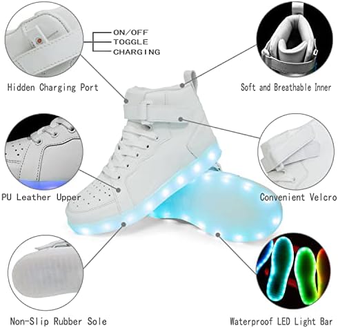 【Healthy Materials】: LED Shoes use High quality PU Leather upper, non-slip durable rubber sole, adjustable laces and velcro for added wrapping. 【11 Light Up Modes】: Shoes with lights have 7 static colors + 4 dynamically color modes. The color can be switched via the inside button of the shoe. Cool sneakers led shoes light up your feet and catch all eyes on you at night. 【Easy Charging】:Equipped with a unique USB charging cable that can charge two shoes at the same time, a 2-hour charge can guarantee 4-5 hours of light(Working period differs by different light up mode). 【Best Gift】: This Light up shoes for adults are perfect for parties and dance performances. They are also great gifts for Birthdays, Halloween, Christmas and New Year. Everyone will like it. 【Clean and Maintenance Instruction】: Use Wet Tower to Clean the Upper directly. For stained and dirty spots, use the sponge eraser to brush the wet upper smoothly, and put the shoes in ventilated pacle to dry it. The shoes could afford water spinkling, but never soak in water. department_name unisex-adult #52,896 in Clothing, Shoes & Jewelry ( ) #251 in #459 in