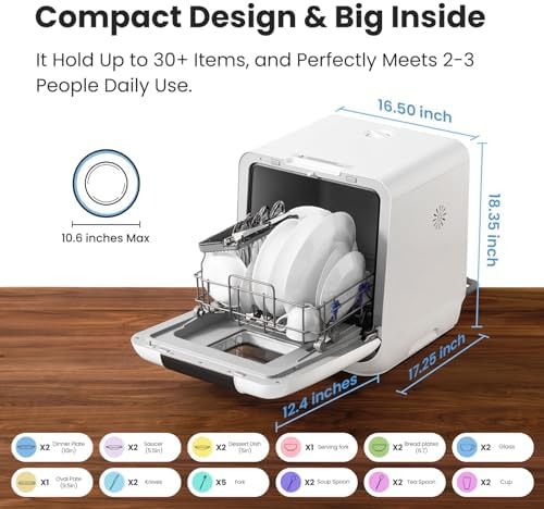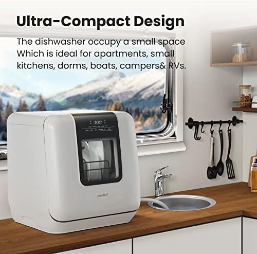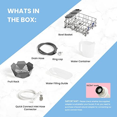[ No installation needed ]: Adding water manually in the upgraded 6 Liter built-in water tank, you can put the dishwasher in any suitable place without connecting to tap water. Or it can be hooked to the kitchen faucet directly with the included quick connect water hose (Adapter included). [ Upgraded Space Design ]: The Miniplus has a larger capacity inside than a normal mini dishwasher, which allows you to load a 10.5-inch plate at a time while occupying a very small area, which is ideal for small houses, apartments, dorms, boats, and campers/RVs. [ 5+2 Program Options ]: 5 Washing programs: NORMAL, RAPID, HYGIENE, FRUIT, GLASS, which meets all your daily cleaning needs. Equipped with 2 enhanced functions: AUTO-OPEN provides effective drying performance; UV Hygiene Program ensures there will be no food particles left behind. [ 192 ℉ High-Temp Hygiene ]: The Hygiene wash cycle boosts water temperature to 162 ℉ Rinsing and Max to 192 ℉ which can tackle heavily soiled dishes and is also suitable for cleaning baby bottles and children’s dinner sets. [ AUTO-OPEN & FAN ENHANCE DRYING ]: The door opens automatically at the end of each cycle, and the extra built-in turbofan lets out the steam and essentially helps your dishes dry quicker, delivering cabinet-ready dishes even faster. [ Lower Water Consumption and Energy Saving ]: The Comfee’ Eco-dishwasher cleans dishes with less effort. Only consumes 6L of water per wash cycle, Saves 60% of the amount used when handwashing and uses only 0.35 kWh for normal cycle. [ Intuitive and Safe Operation ]: LED Digital Display, See-Through Viewing Window, Child Lock, and Leak Protection allow for an easy and safe operation. (Note: COMFEE dishwashers are tested at the factory before they are shipped. If your new dishwasher has some water inside, this is normal.)