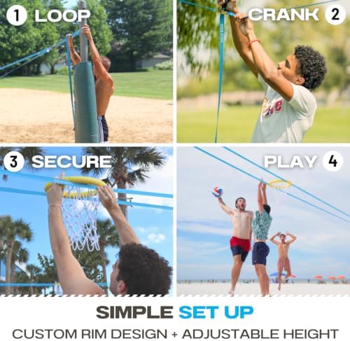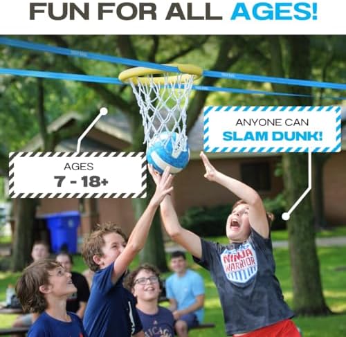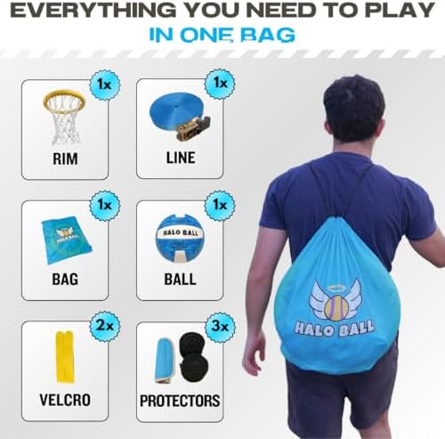 【First Ever Truly Portable Hoop】: Take your lightweight, portable basketball hoop anywhere: beach, park, pool, backyard, gym, and more! All you need is 2 anchor points and you're ready to play this viral sport anywhere you want! 【Simple Adjustable Set Up】: Halo Ball can be set up and down with ease to any height desired. Teens or adults can set up the portable basketball hoop in just a few minutes using the instruction manual or tutorial videos provided! 【Durable for a Lifetime】: Built to withstand the test of time, this outdoor basketball hoop is constructed with premium materials that can hold over 800 lbs. The shock-absorption rim, slash-proof line, and anti-rust ratchet all contribute to its longevity! 【Fun for All Ages】: Experience the thrill of the Halo Ball game with your friends and family when you play this exciting outdoor lawn and yard game. Anyone can dunk and take part in the sport that you won't be able to stop playing! 【Set Includes】: { 1 Custom Ball } { 1 Rim + Net} {1 Slackline + Ratchet} { 3 Velcro Straps} {2 Tree Protectors} {1 Ratchet Protector} {1 Carrying Bag}