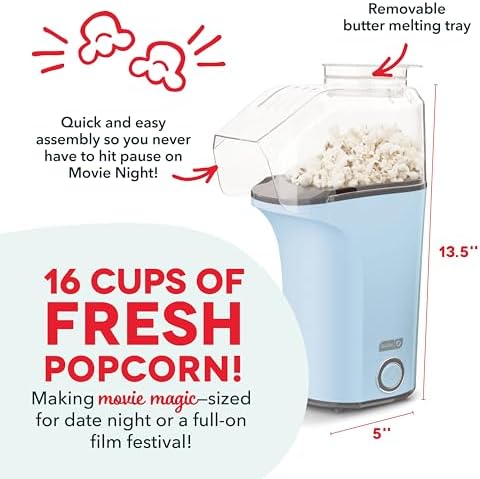 QUICK plus EASY: Simply measure and add your popcorn kernels to the high capacity heating chamber, then push the one Touch start button, for Hot and fresh popcorn in minutes. It’s so easy, even your kids can do it. HEALTHIER: The Dash Popcorn Machine uses hot air (no oil or added preservative from a microwave bag) to quickly and efficiently pop 16 cups of hot and fresh popcorn. Perfect for parties, large group gatherings, or a quiet date night in. MULTIFUNCTIONAL: The included measuring cup doubles as a butter melting tray on the top of the machine - simply add a tablespoon of butter while your popcorn pops and pour once melted for movie theater-style popcorn. COMPACT: The Dash Popcorn Machine is your must-have for that first apartment, smaller kitchen, college dorm life, or camper/RV traveling. Plus, its sleek design and trendy color options will accent any kitchen space; makes a perfect gift. INCLUDES: The Amazon exclusive Dash 16 cup Popcorn Machine includes a measuring cup for popcorn kernels and melting butter, recipe book.